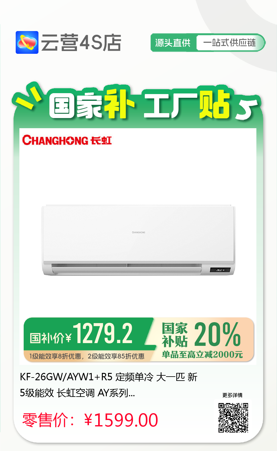 长虹 大1匹挂机 AY 新5级能效 单冷定频空调 KF-26GW/AYW1+R5