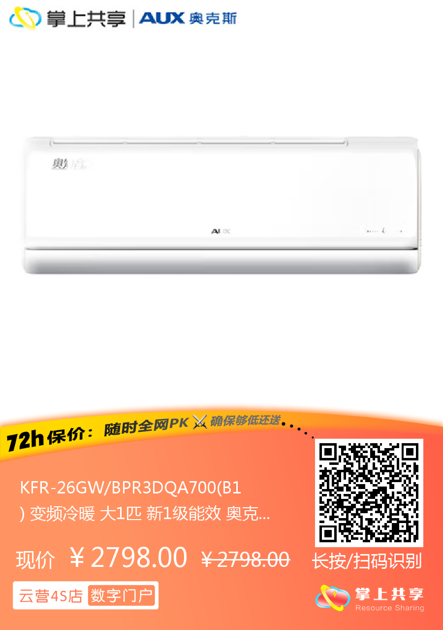 KFR-26GW/BPR3DQA700(B1) 变频冷暖 大1匹 新1级能效 奥克斯空调 奥知音系列