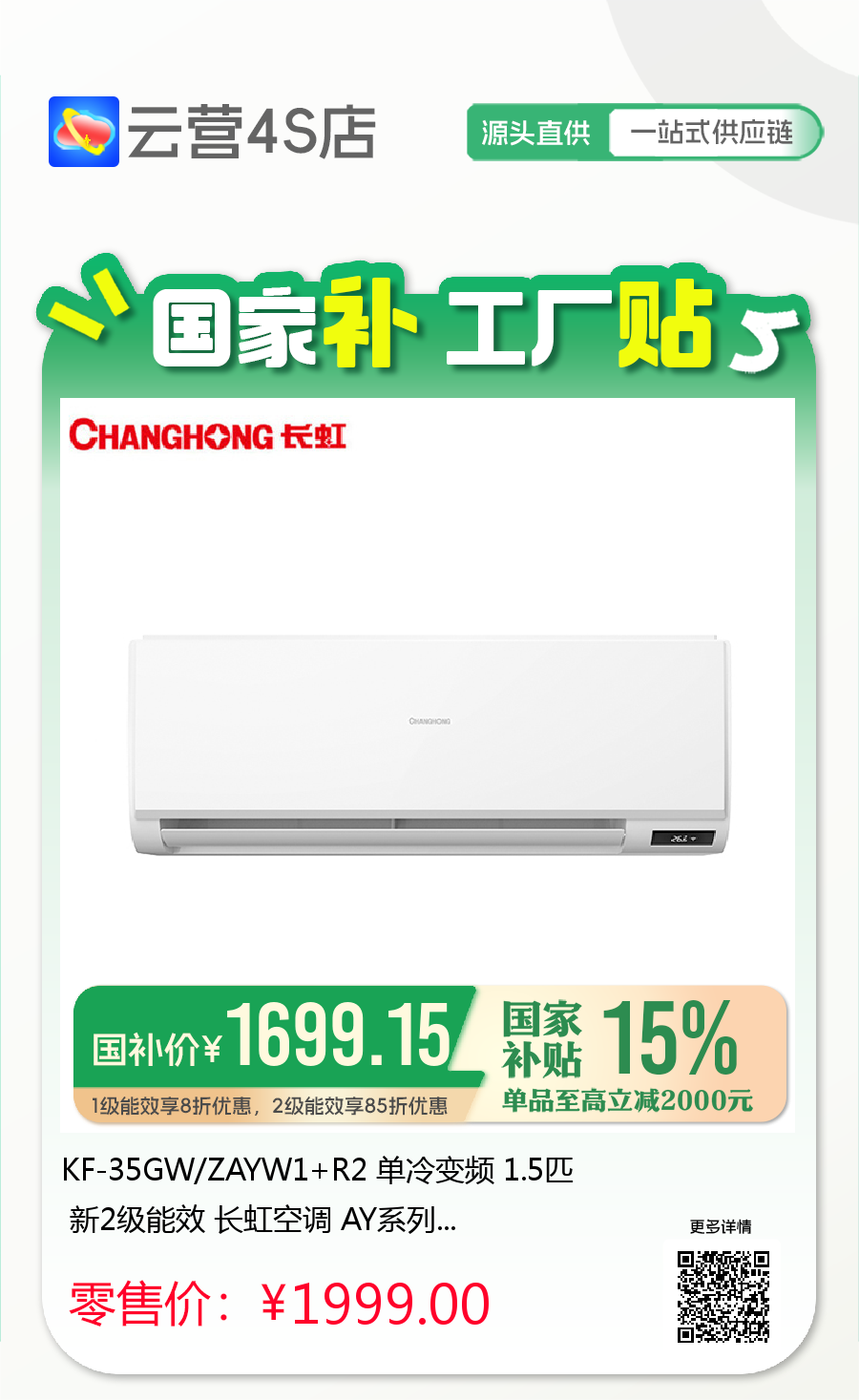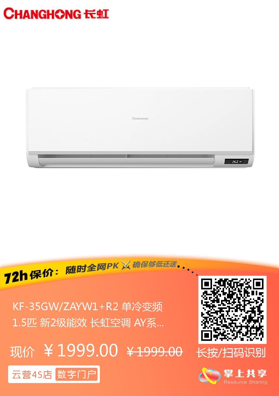 长虹 1.5匹挂机 AY 新2级能效 单冷变频空调 KF-35GW/ZAYW1+R2