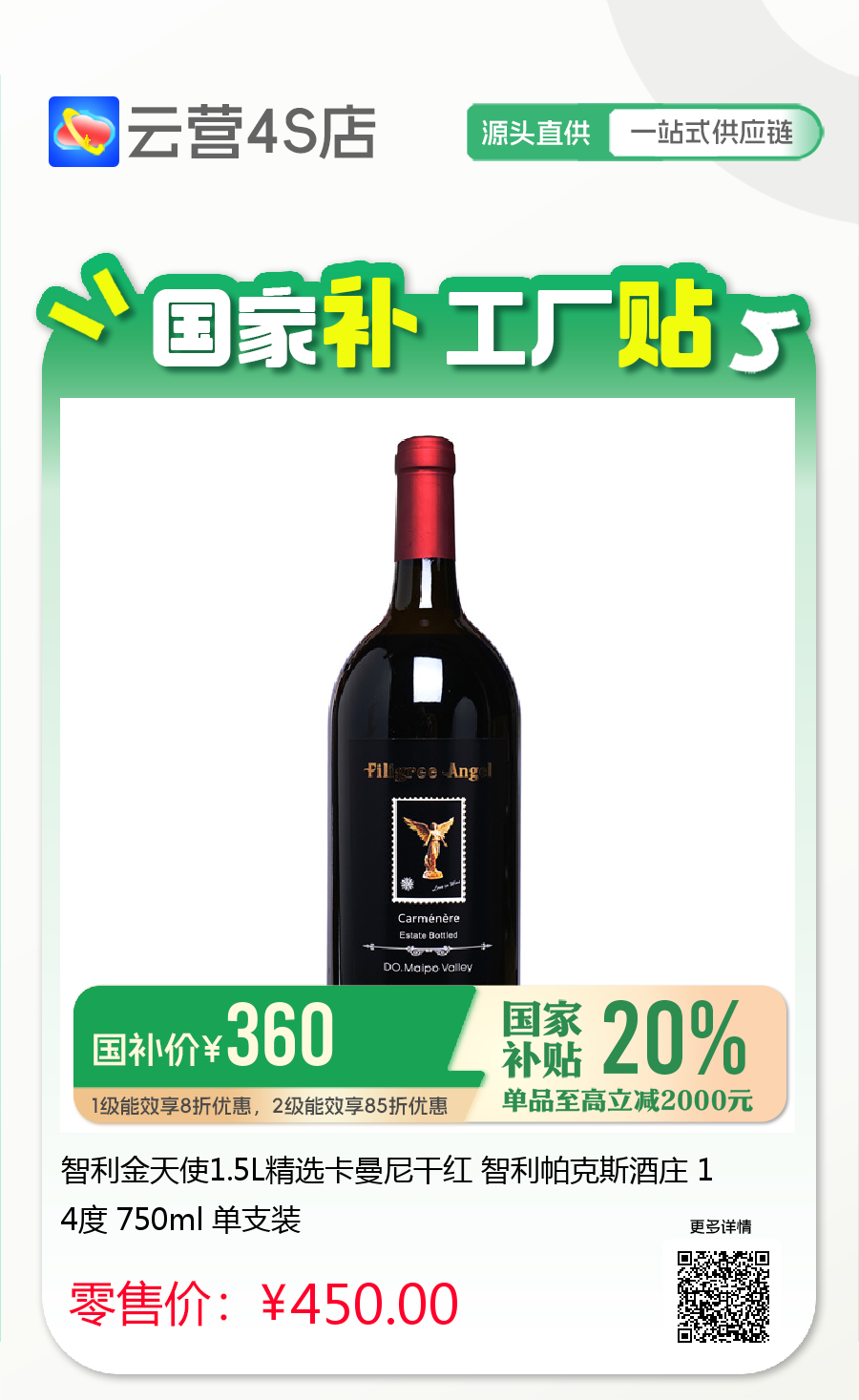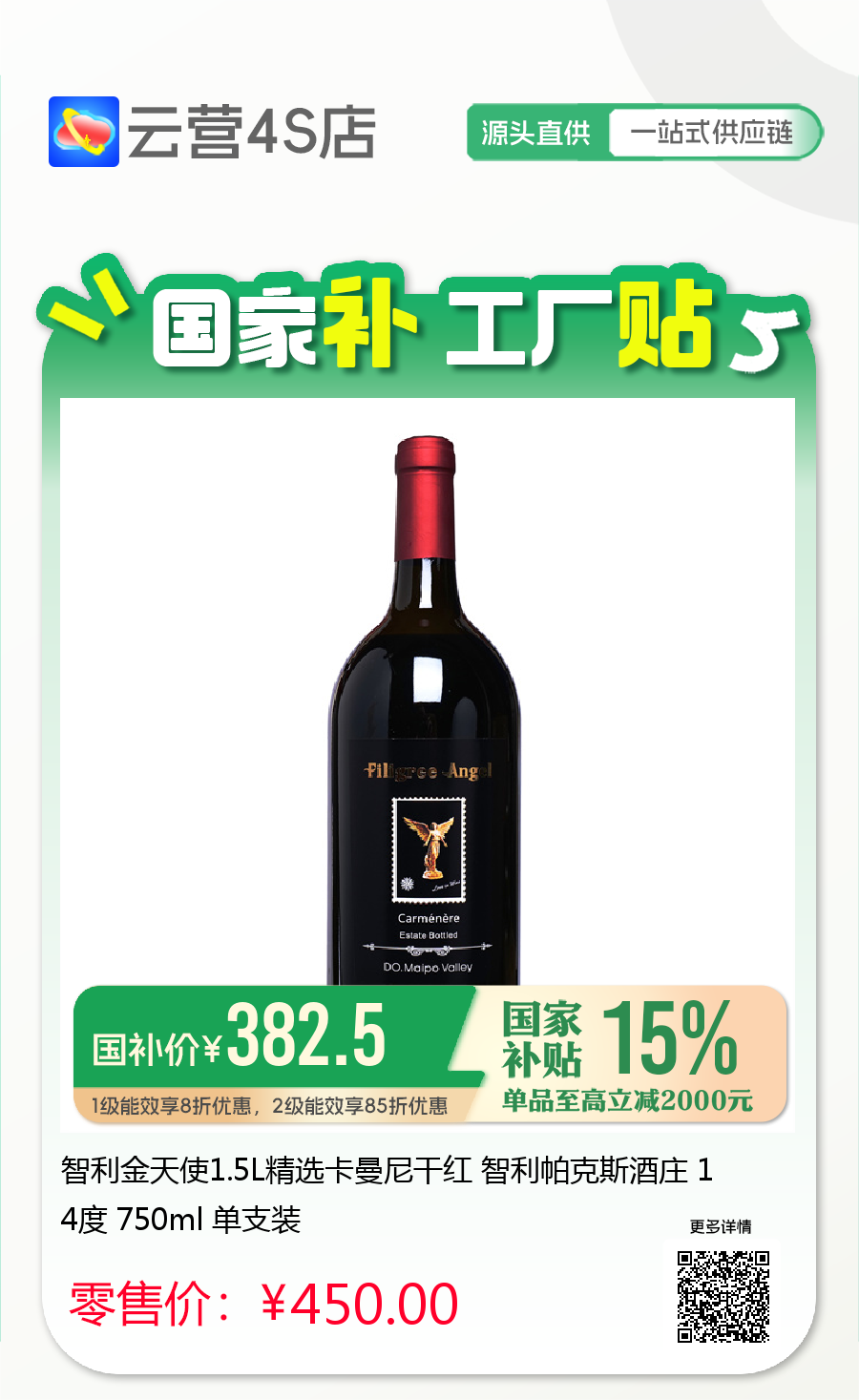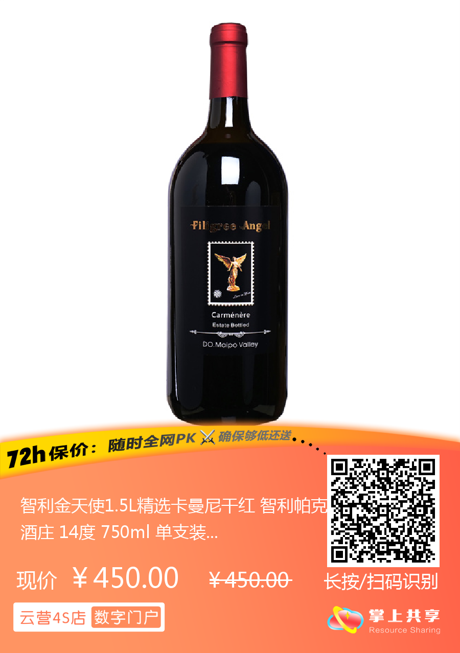 智利金天使1.5L精选卡曼尼干红 智利帕克斯酒庄 14度 750ml 单支装