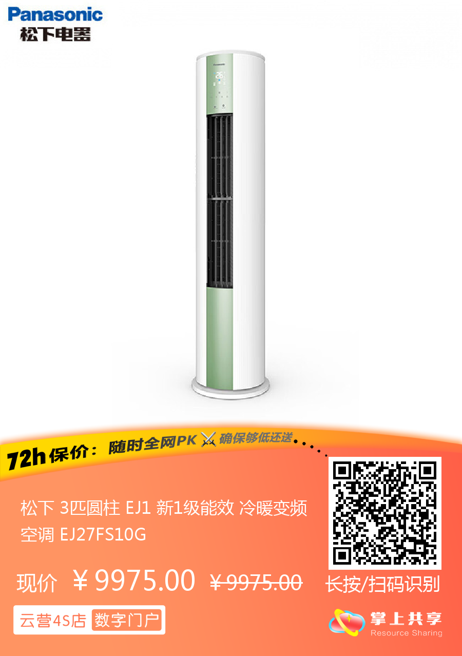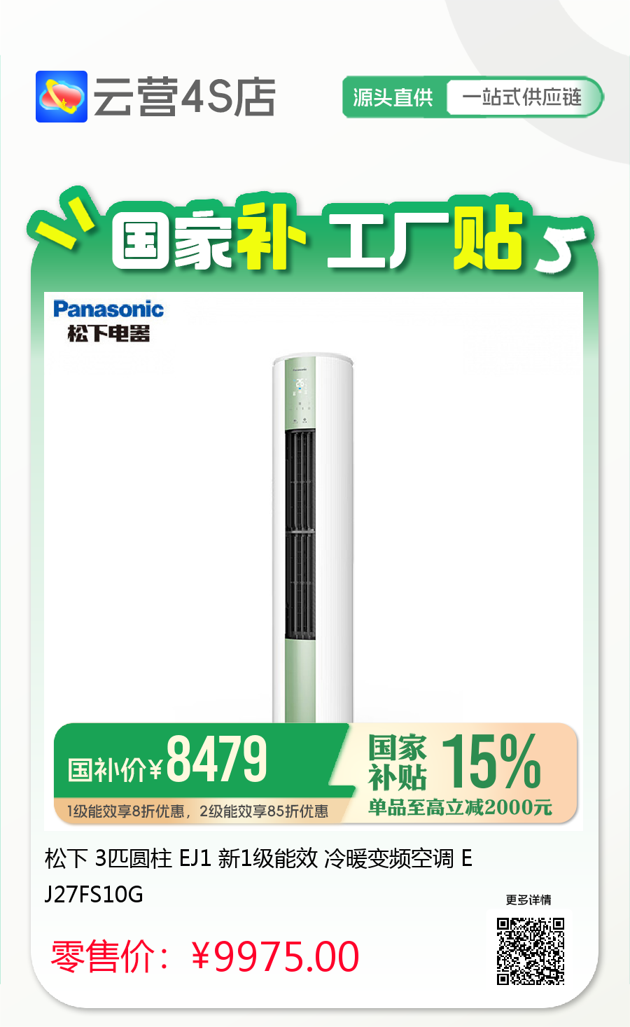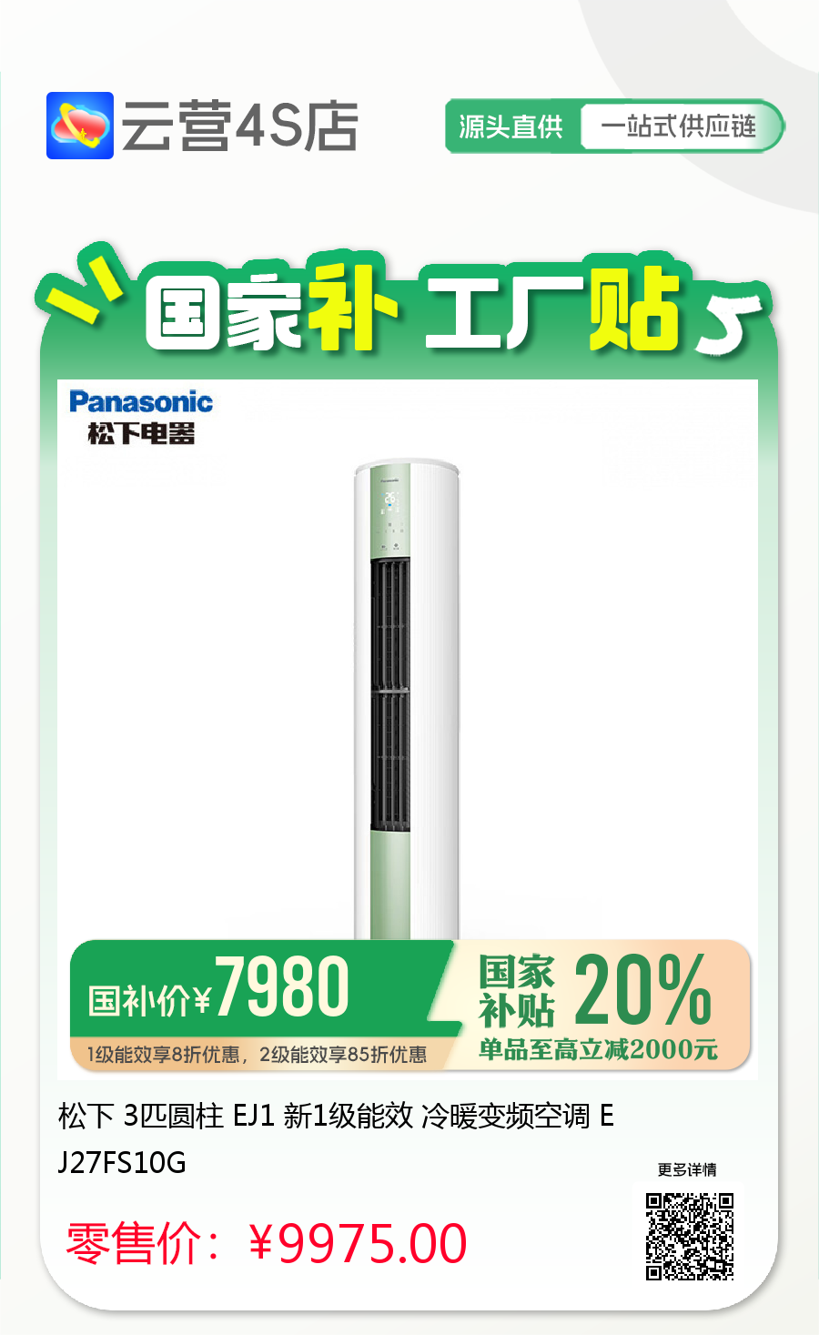 松下 3匹圆柱 EJ1 新1级能效 冷暖变频空调 EJ27FS10G
