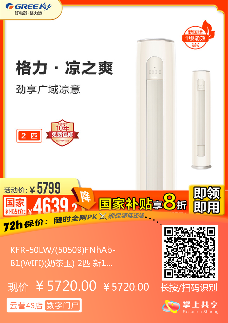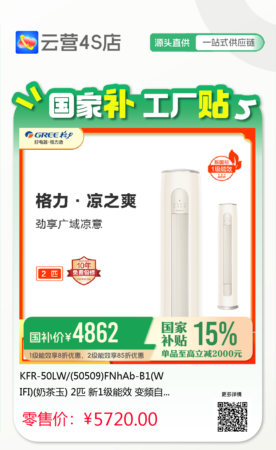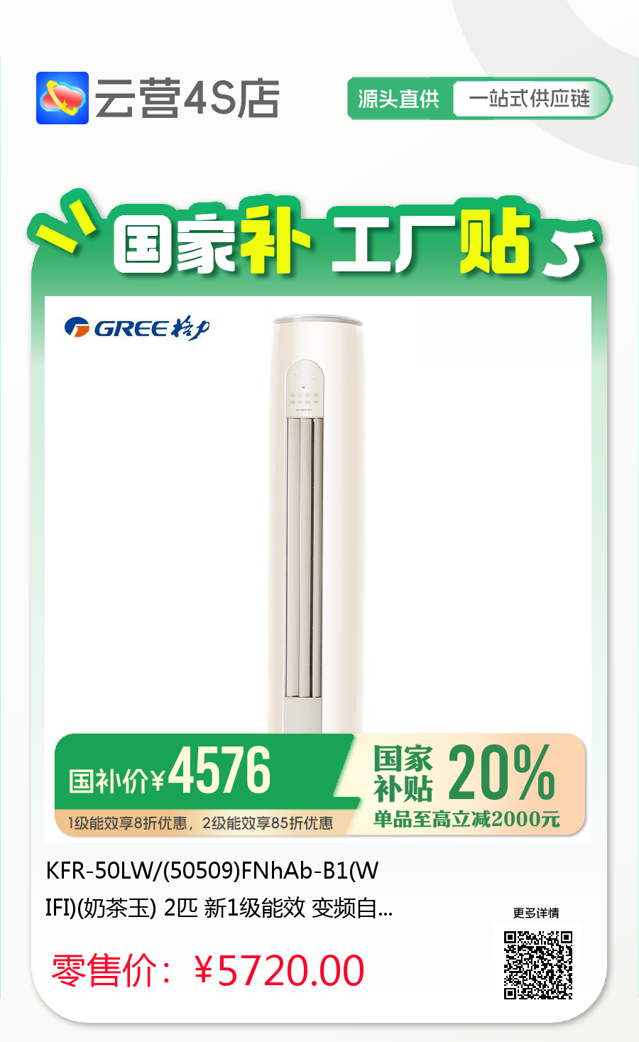 格力 2匹圆柱 凉之爽 新1级能效 冷暖变频空调 KFR-50LW/(50509)FNhAb-B1(WIFI)(奶茶玉)