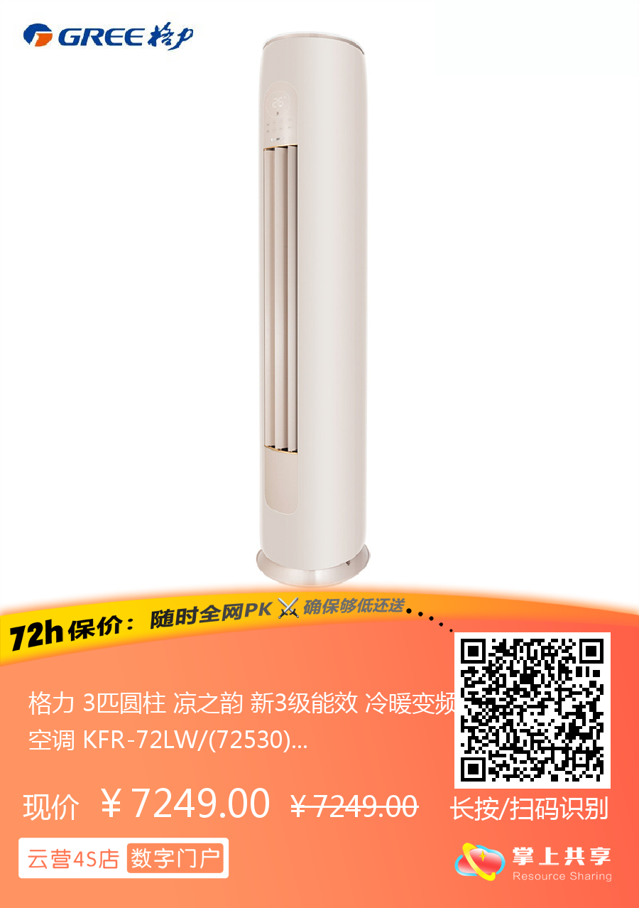 格力 3匹圆柱 凉之韵 新3级能效 冷暖变频空调 KFR-72LW/(72530)FNhAv-B3(珊瑚玉)