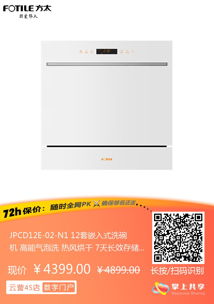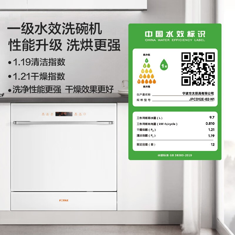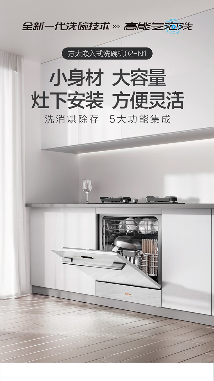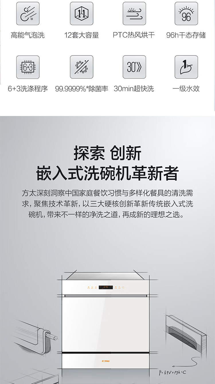 JPCD12E-02-N1 12套嵌入式洗碗机 高能气泡洗 热风烘干 7天长效存储 30min超快洗 一级水效 方太(FOTILE)