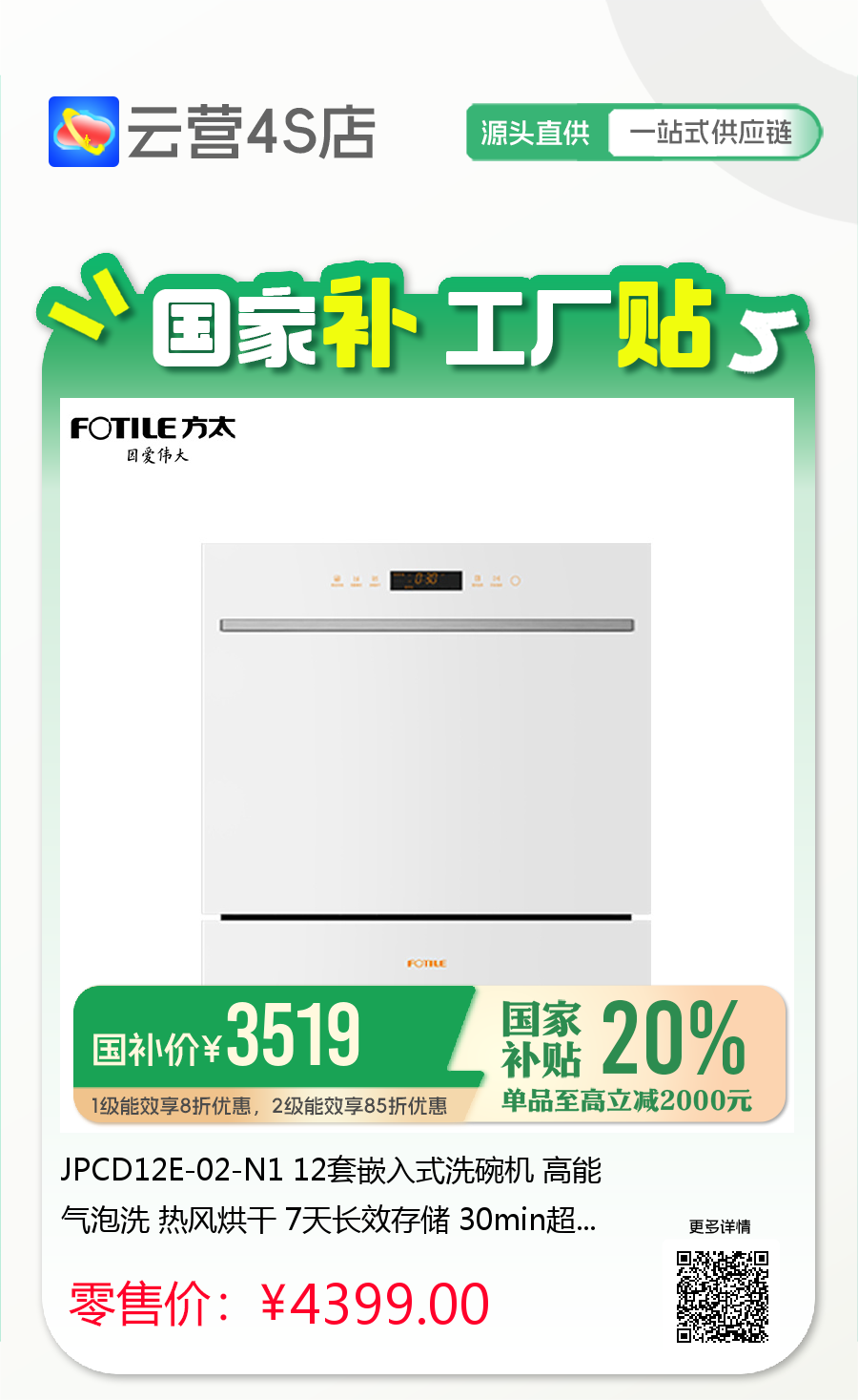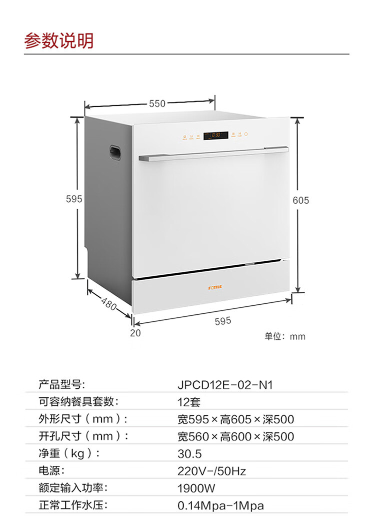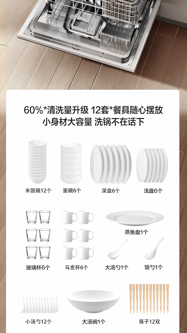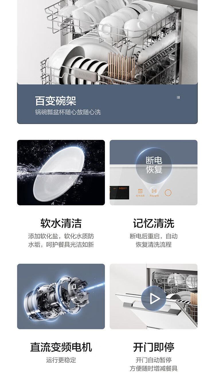 JPCD12E-02-N1 12套嵌入式洗碗机 高能气泡洗 热风烘干 7天长效存储 30min超快洗 一级水效 方太(FOTILE)