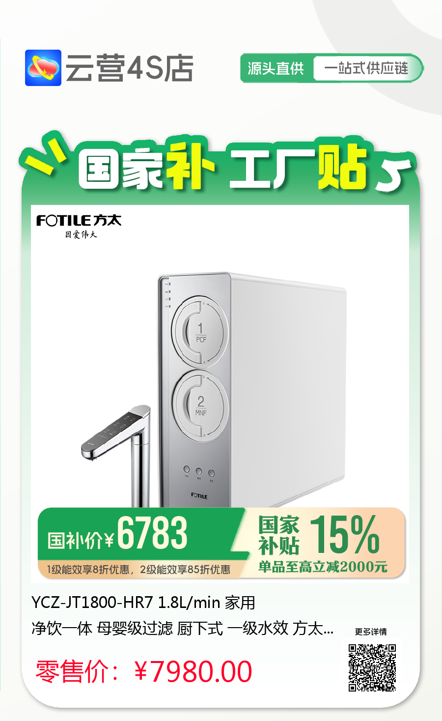 YCZ-JT1800-HR7 1.8L/min 家用净饮一体 母婴级过滤 厨下式 一级水效 方太(FOTILE)
