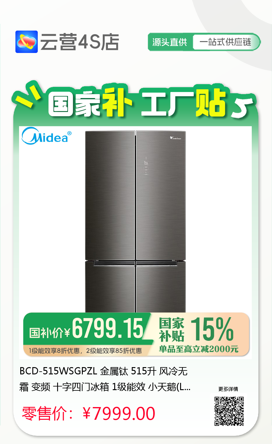 BCD-515WSGPZL 金属钛 515升 风冷无霜 变频 十字四门冰箱 1级能效 小天鹅(LitteSwan)