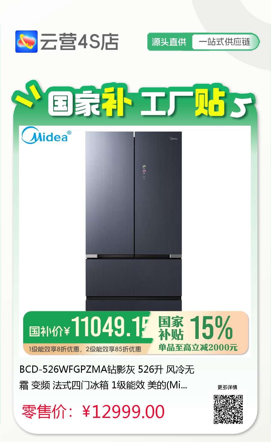 BCD-526WFGPZMA钻影灰 526升 风冷无霜 变频 法式四门冰箱 1级能效 美的(Midea)