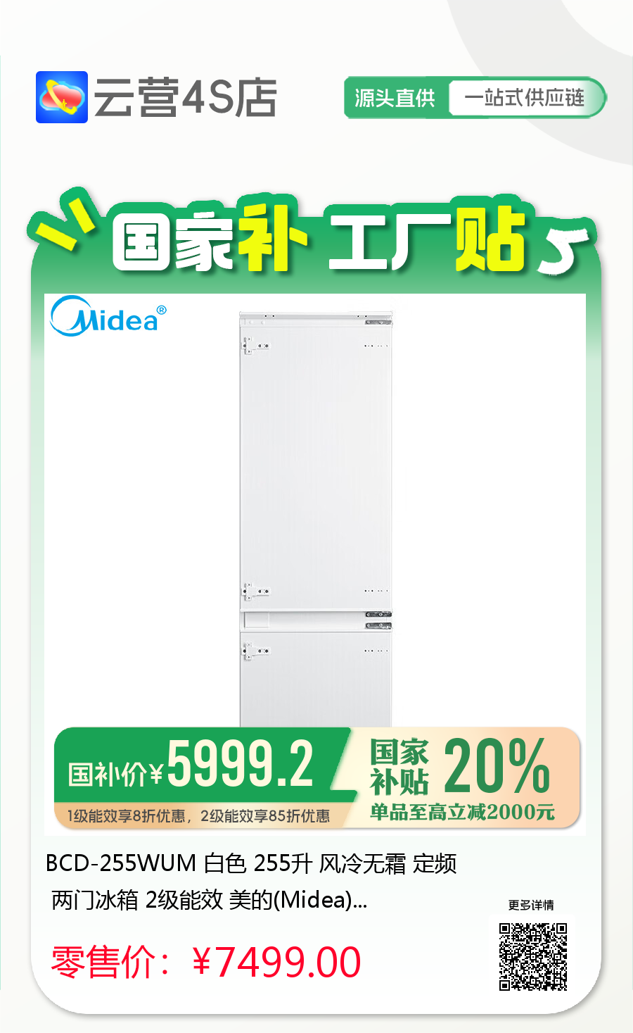 BCD-255WUM 白色 255升 风冷无霜 定频 两门冰箱 2级能效 美的(Midea)