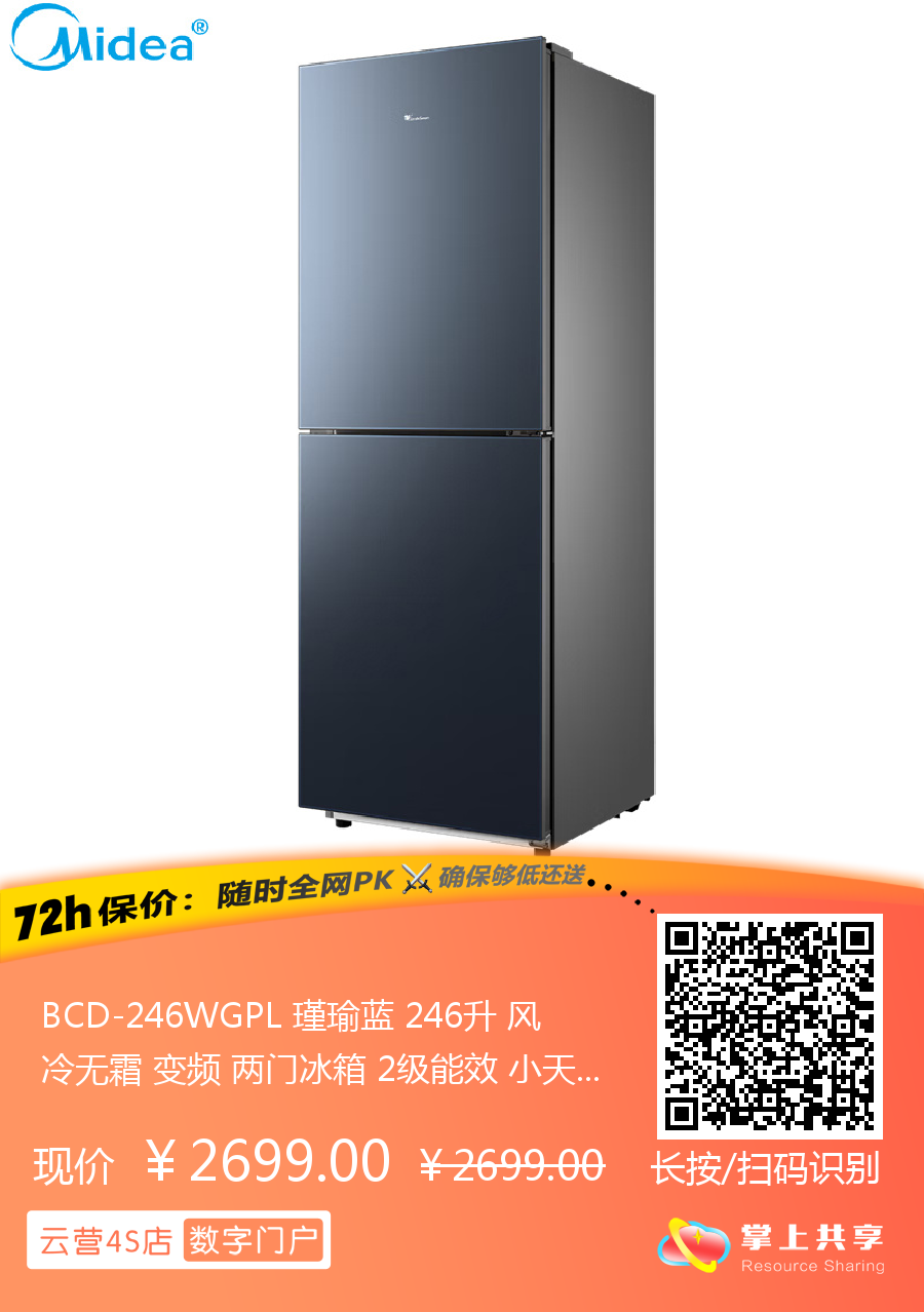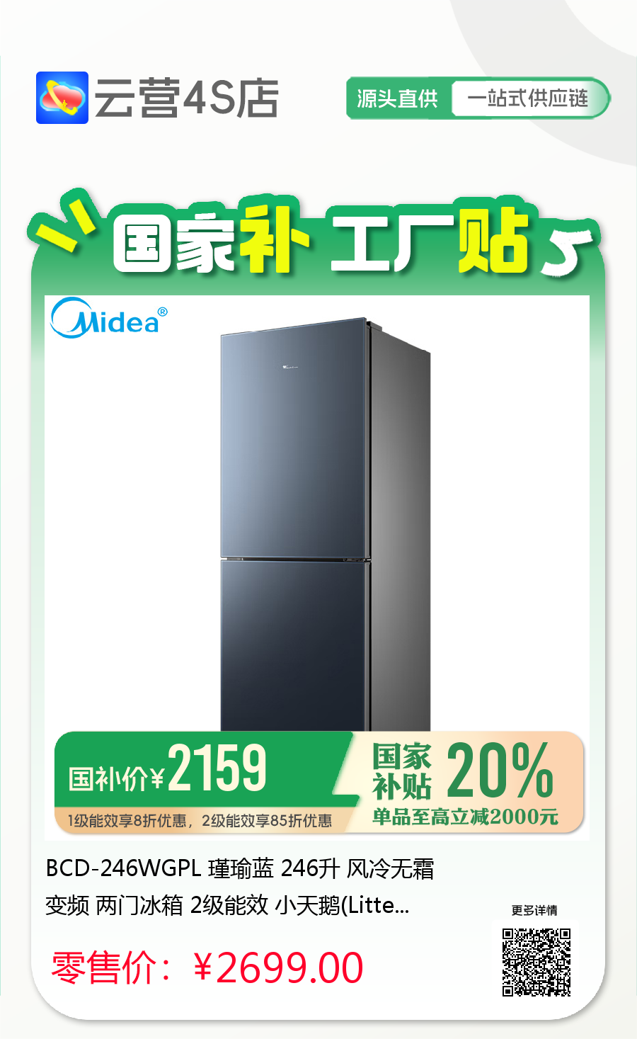 BCD-246WGPL 瑾瑜蓝 246升 风冷无霜 变频 两门冰箱 2级能效 小天鹅(LitteSwan)