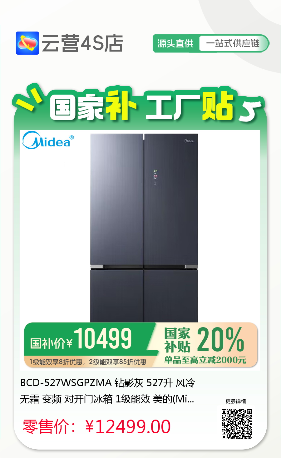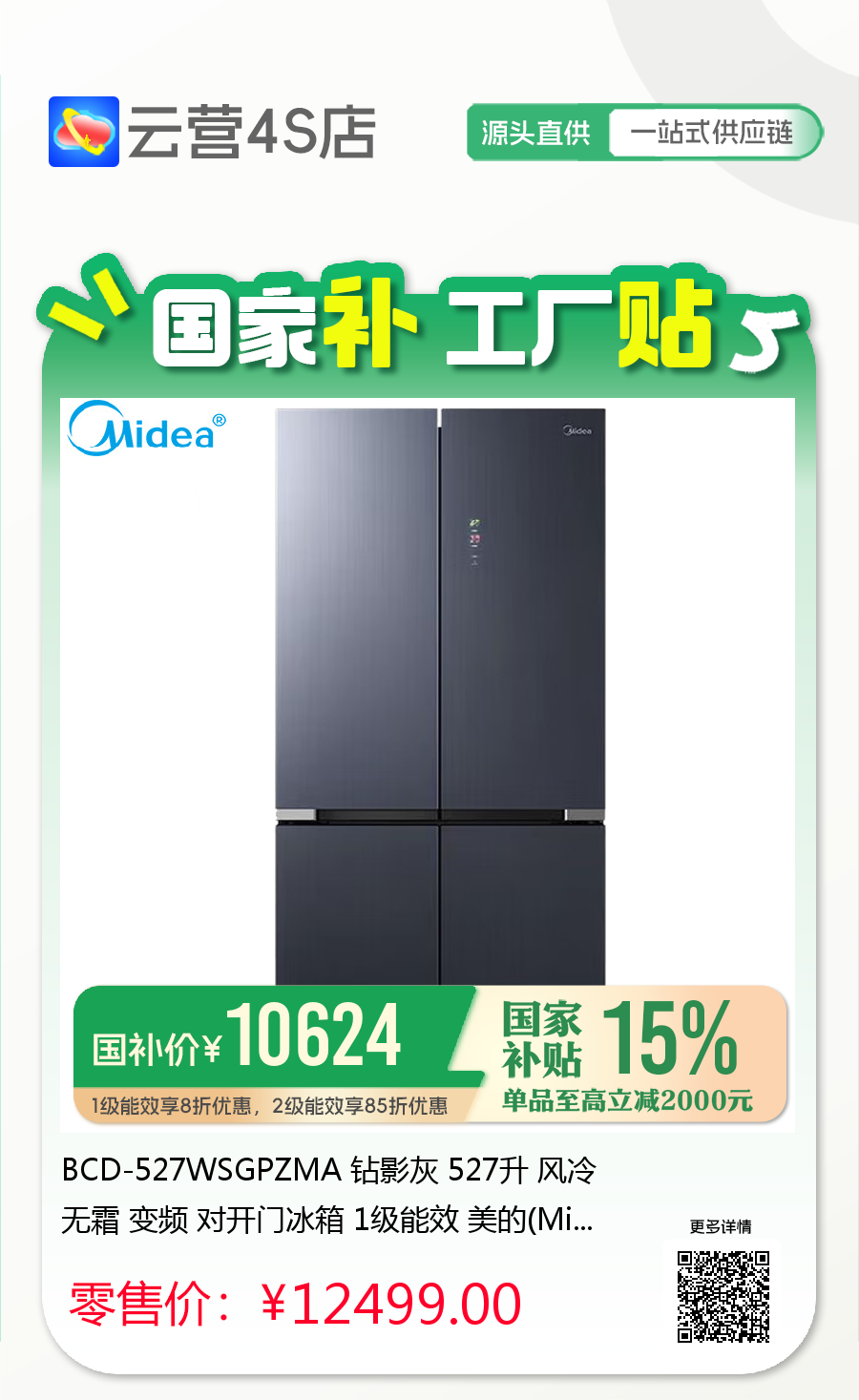 BCD-527WSGPZMA 钻影灰 527升 风冷无霜 变频 对开门冰箱 1级能效 美的(Midea)