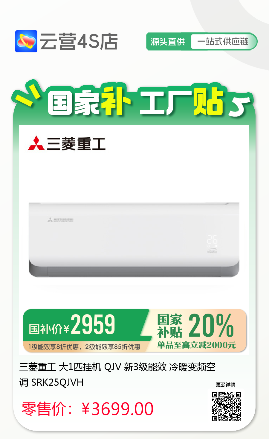 三菱重工 大1匹挂机 QJV 新3级能效 冷暖变频空调 SRK25QJVH