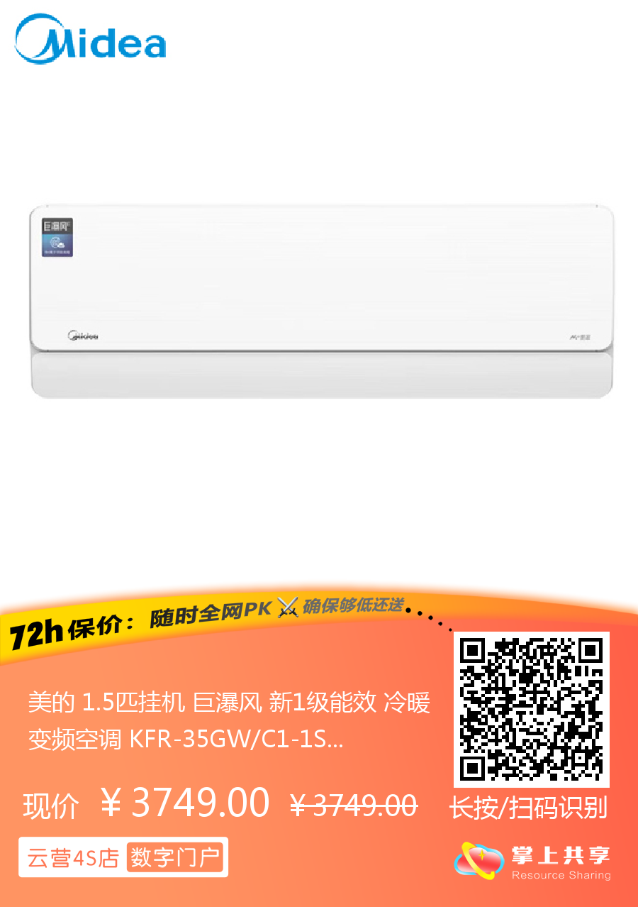 美的 1.5匹挂机 巨瀑风 新1级能效 冷暖变频空调 KFR-35GW/C1-1S