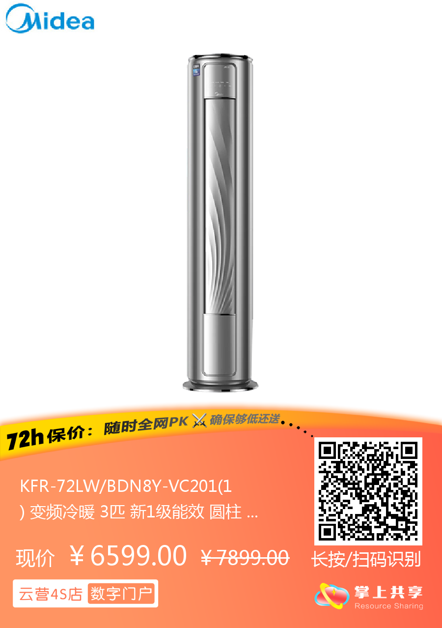 美的 3匹圆柱 巨瀑风 新1级能效 冷暖变频空调 KFR-72LW/BDN8Y-VC201(1)