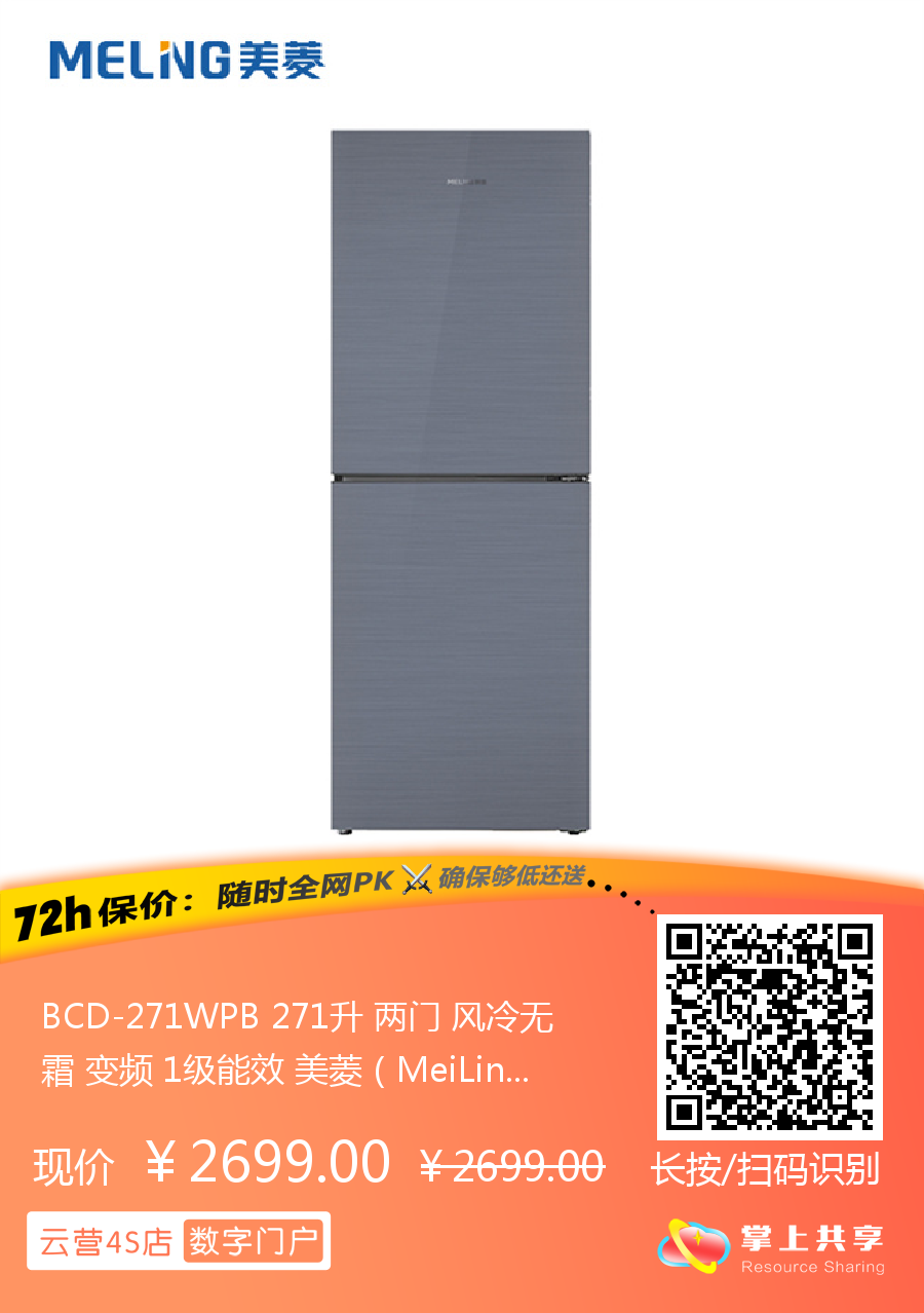 BCD-271WPB 271升 两门 风冷无霜 变频 1级能效 美菱(MeiLing)