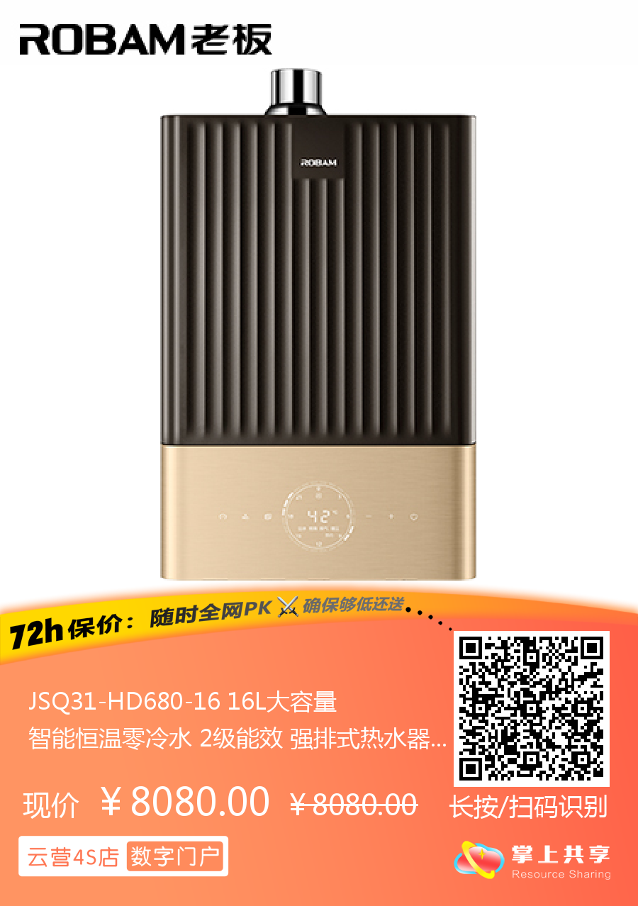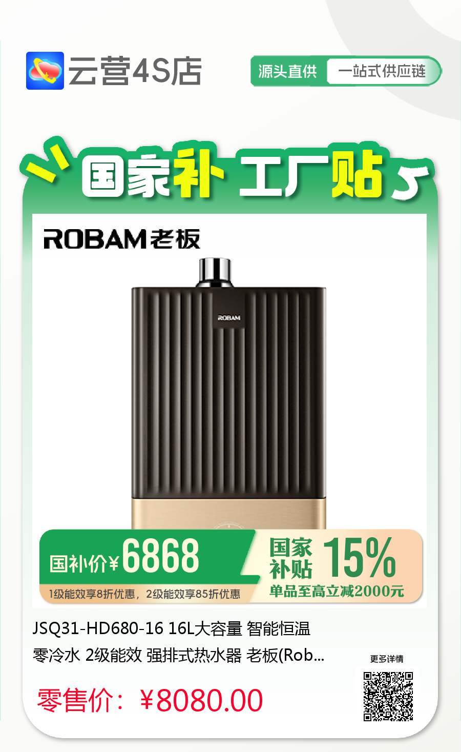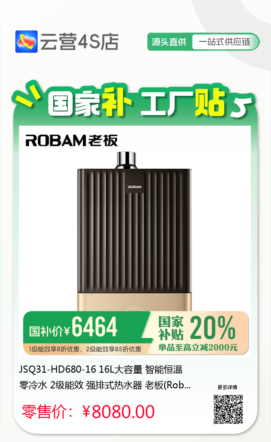 JSQ31-HD680-16 16L大容量 智能恒温零冷水 2级能效 强排式热水器 老板(Robam)