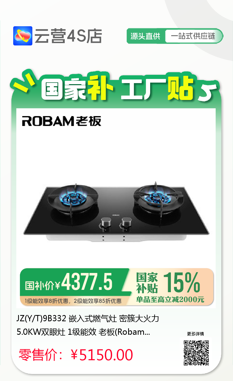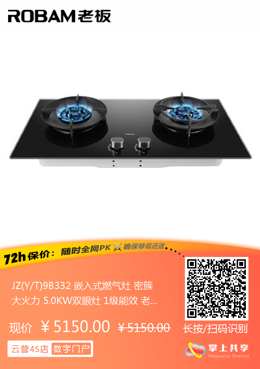 JZ(Y/T)9B332 嵌入式燃气灶 密簇大火力 5.0KW双眼灶 1级能效 老板(Robam)