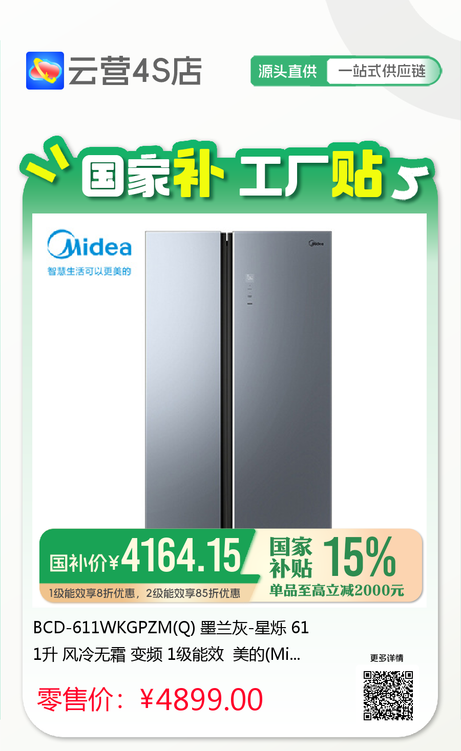 BCD-611WKGPZM(Q) 墨兰灰-星烁 611升 风冷无霜 变频 1级能效 美的(Midea)