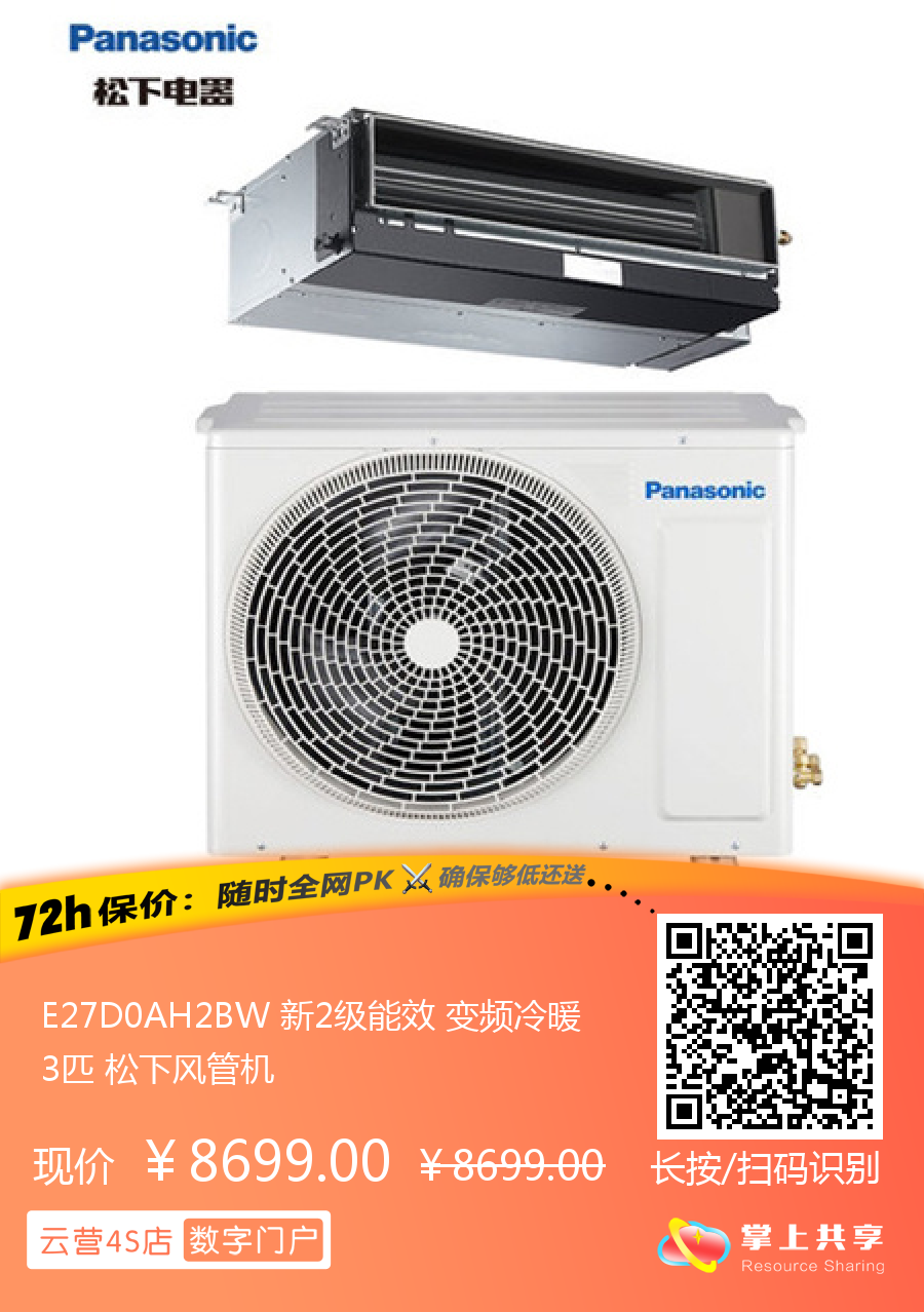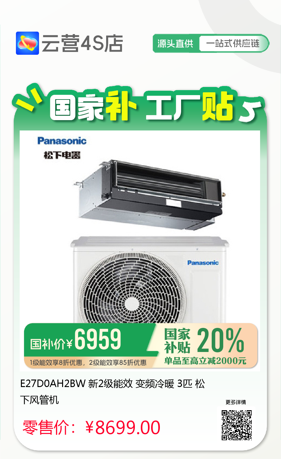 E27D0AH2BW 新2级能效 变频冷暖 3匹 松下风管机