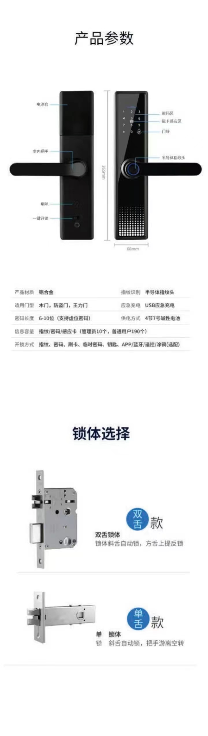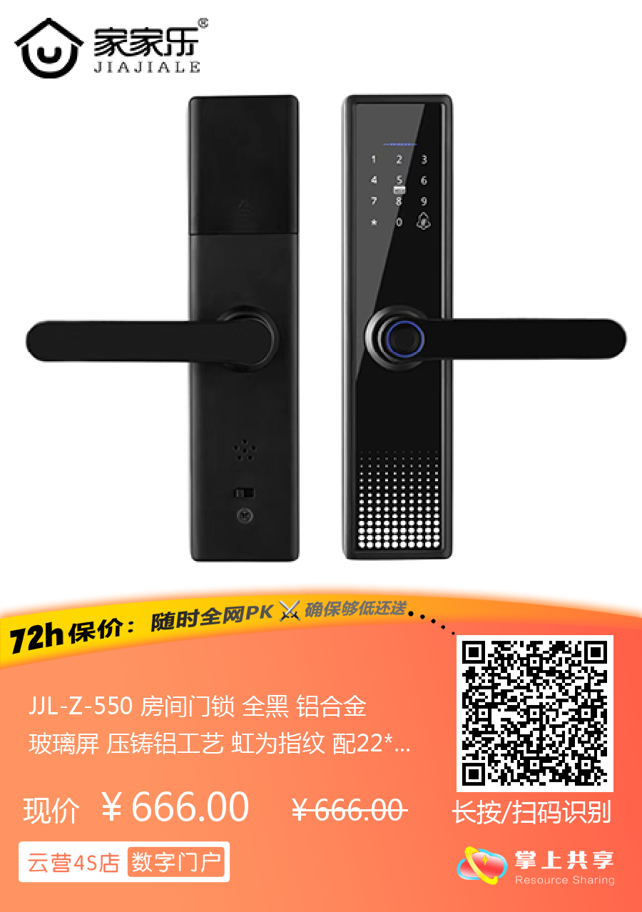 JJL-Z-550 房间门锁 全黑 铝合金 玻璃屏 压铸铝工艺 虹为指纹 配22*160/50锁体 家家乐智能锁