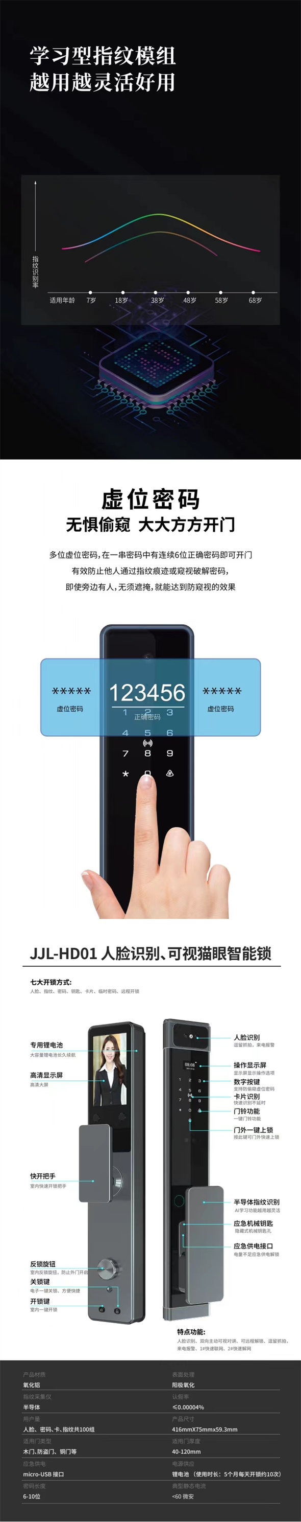 HD01 氧化铝CNC精雕 AI人脸识别 人脸猫眼款 家家乐智能锁