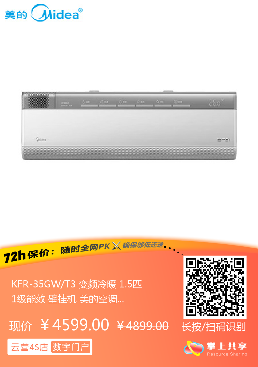 美的 1.5匹挂机 空气机T3 新1级能效 冷暖变频空调 KFR-35GW/T3