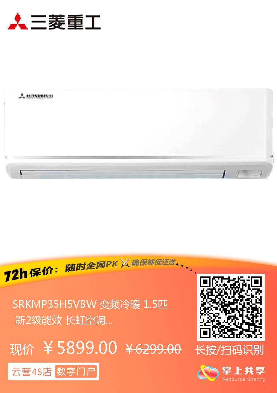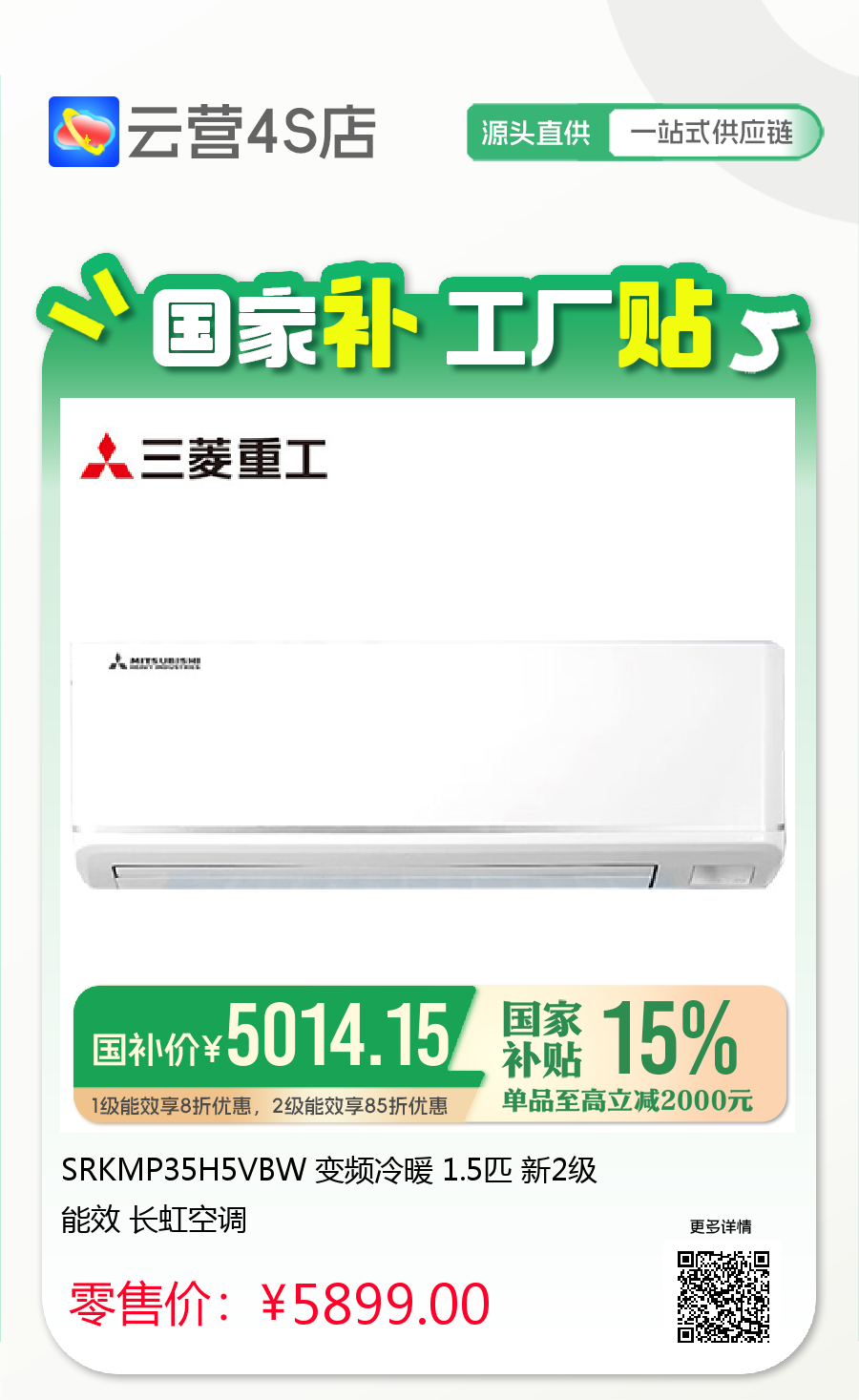 三菱重工 1.5匹挂机 MPV5 新2级能效 冷暖变频空调 SRKMP35H5VBW
