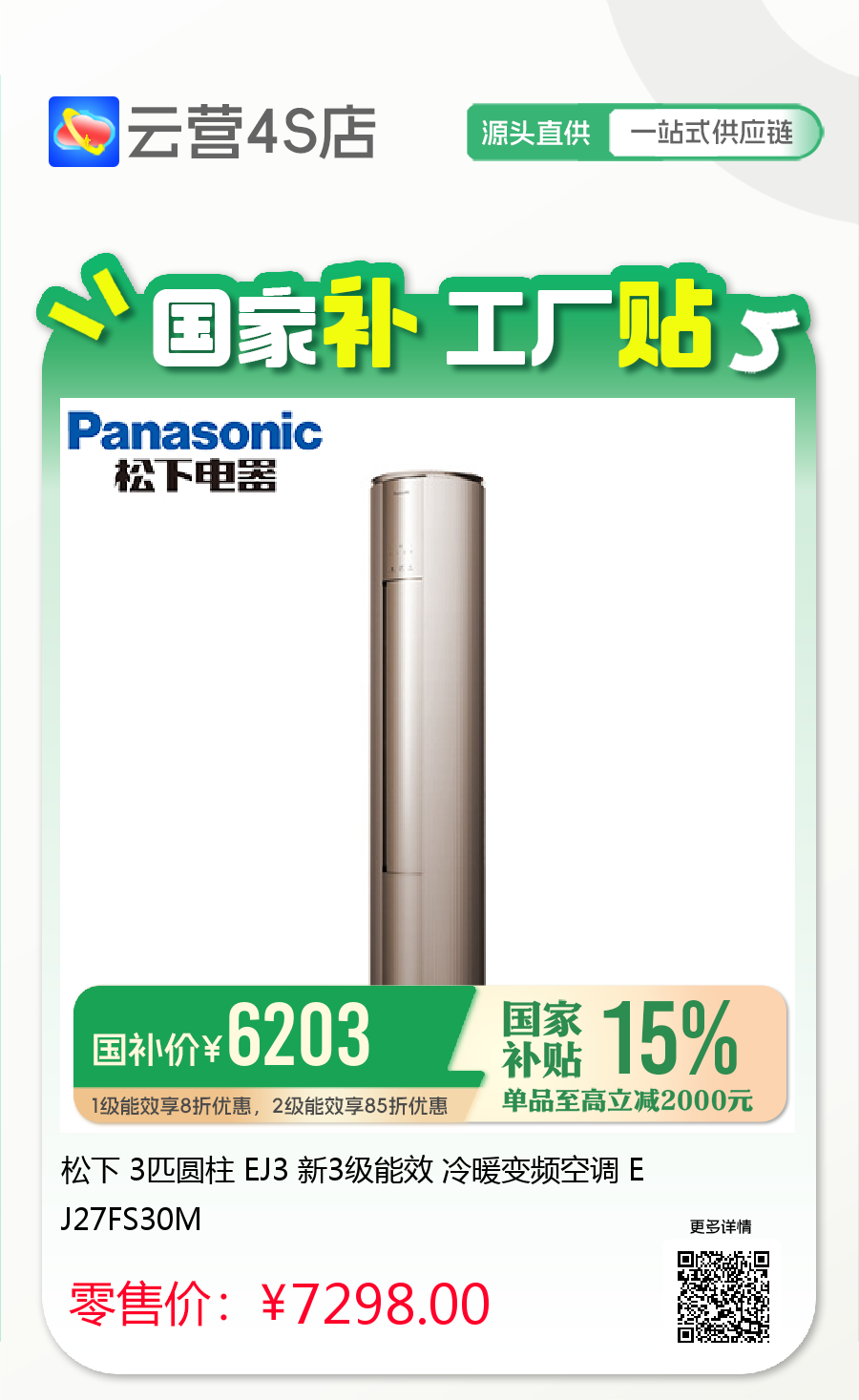 松下 3匹圆柱 EJ3 新3级能效 冷暖变频空调 EJ27FS30M