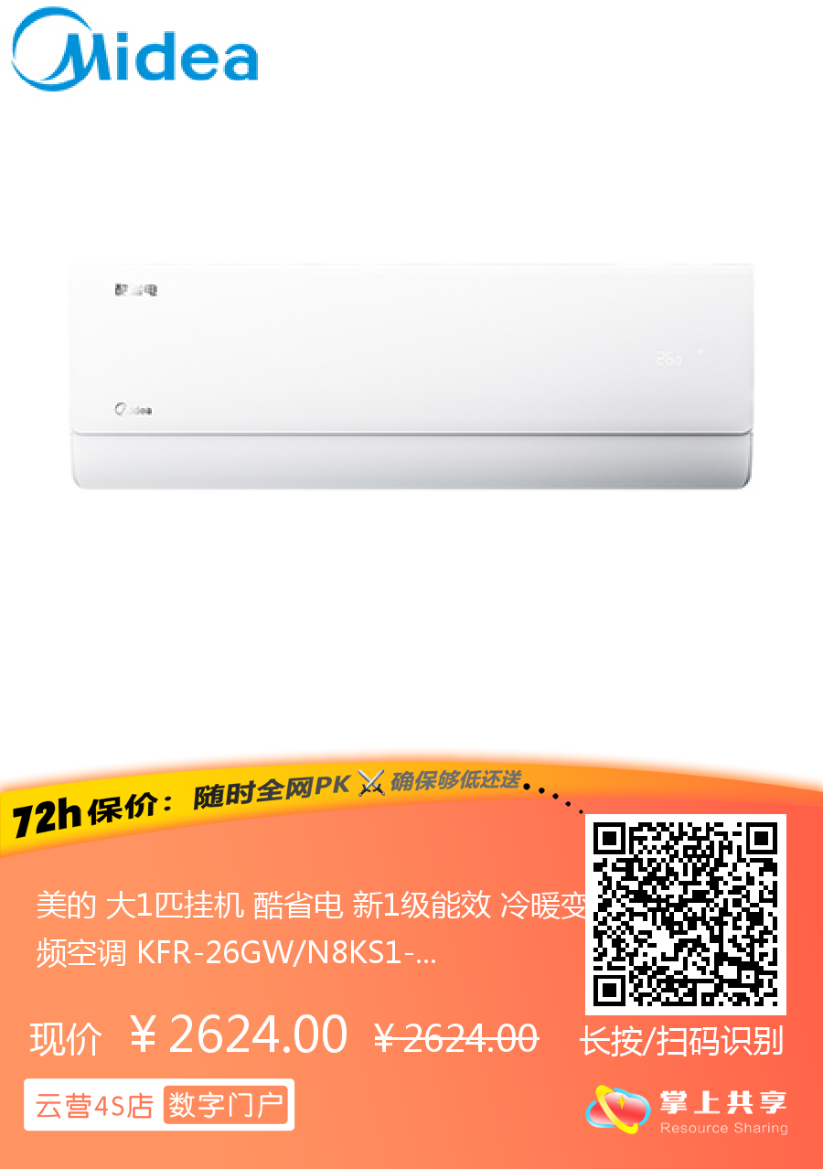 美的 大1匹挂机 酷省电 新1级能效 冷暖变频空调 KFR-26GW/N8KS1-1