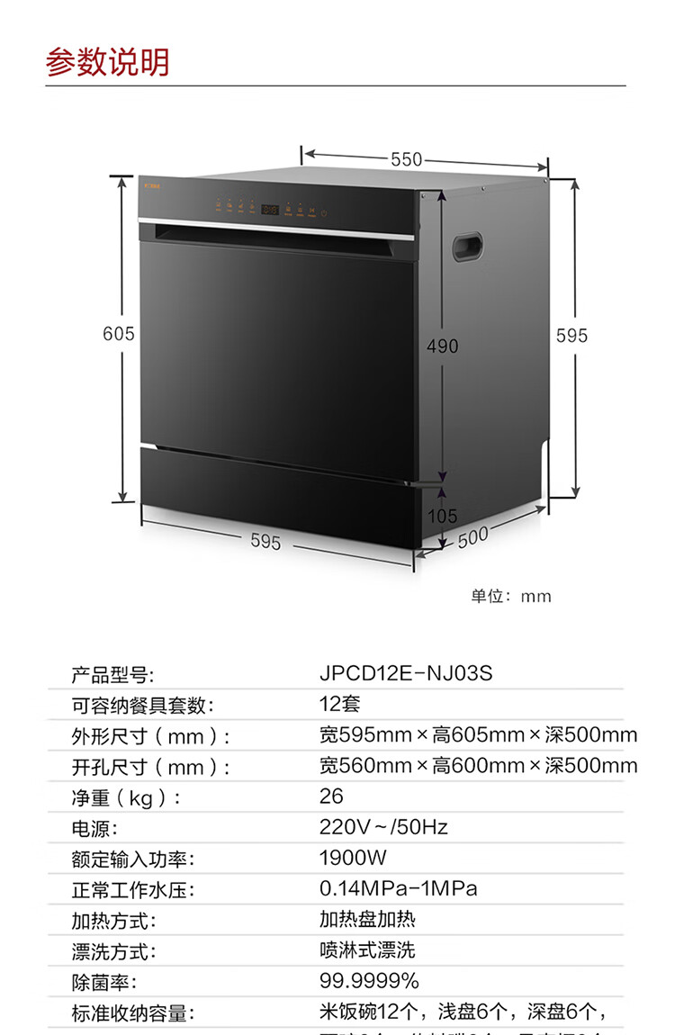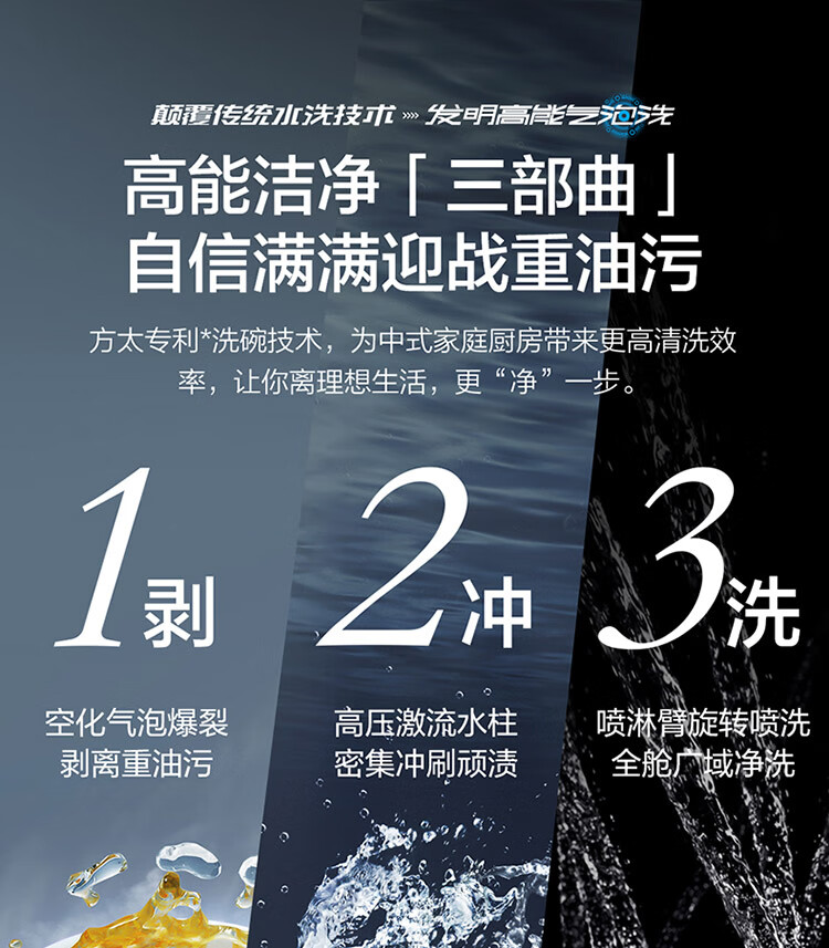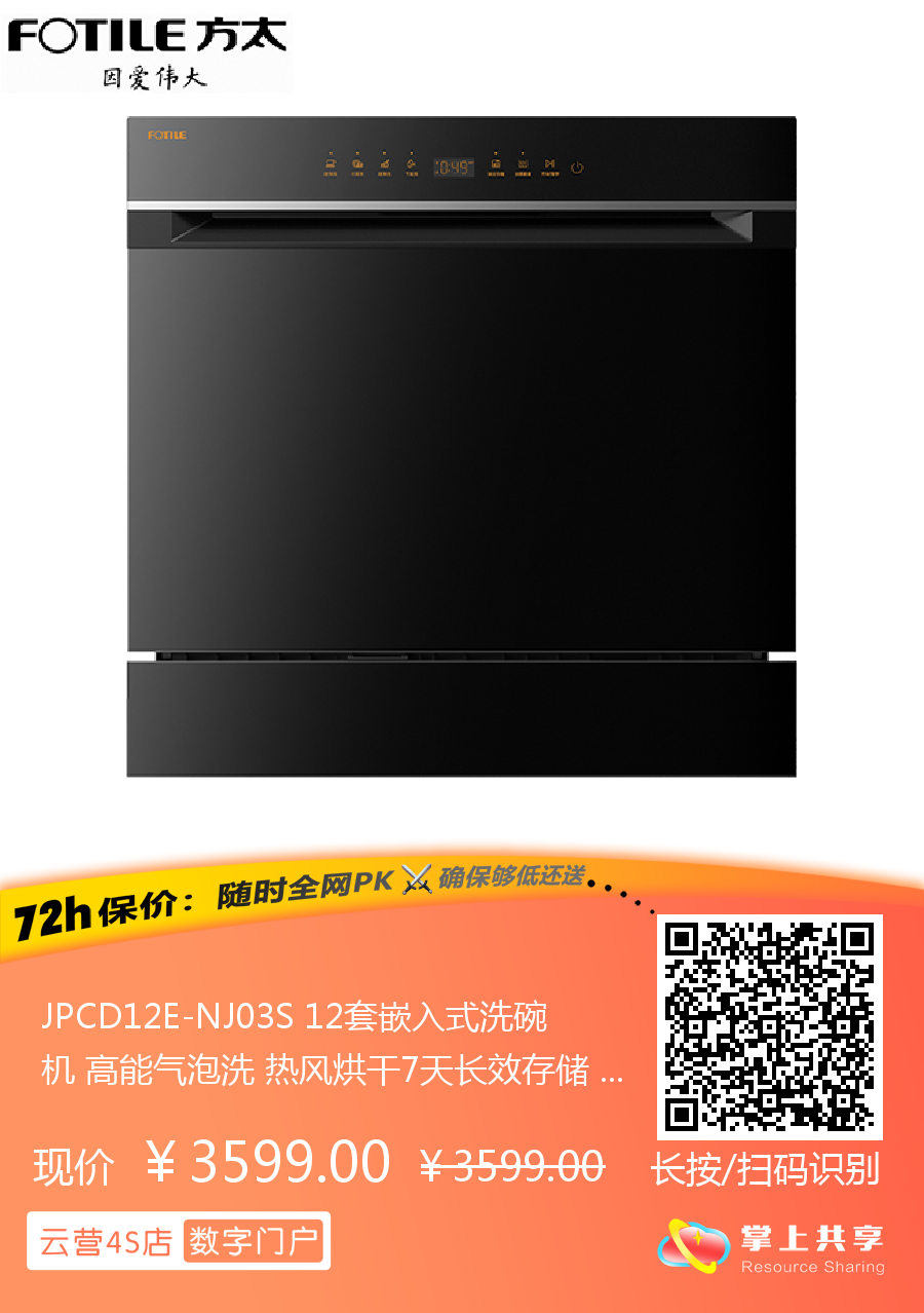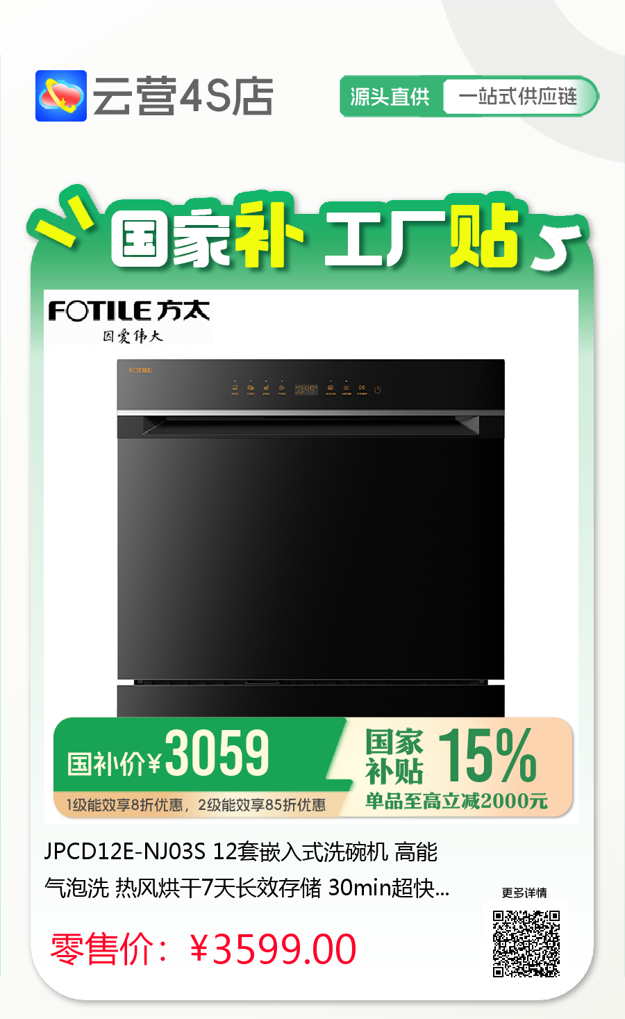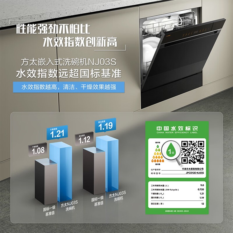 JPCD12E-NJ03S 12套嵌入式洗碗机 高能气泡洗 热风烘干7天长效存储 30min超快洗 一级水效 方太(FOTILE)