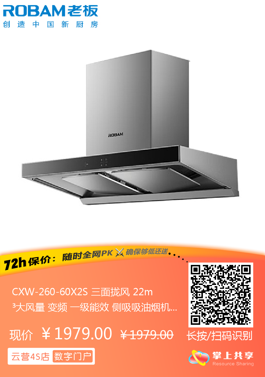 CXW-260-60X2S 三面拢风 22m³大风量 变频 一级能效 侧吸吸油烟机 老板(Robam)