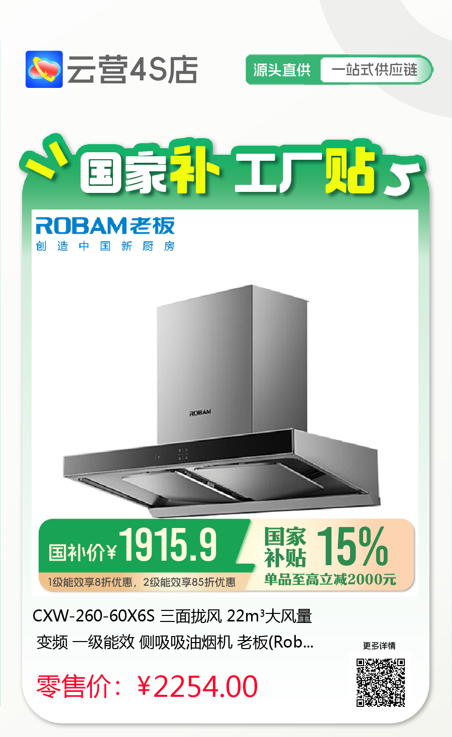 CXW-260-60X6S 三面拢风 22m³大风量 变频 一级能效 侧吸吸油烟机 老板(Robam)