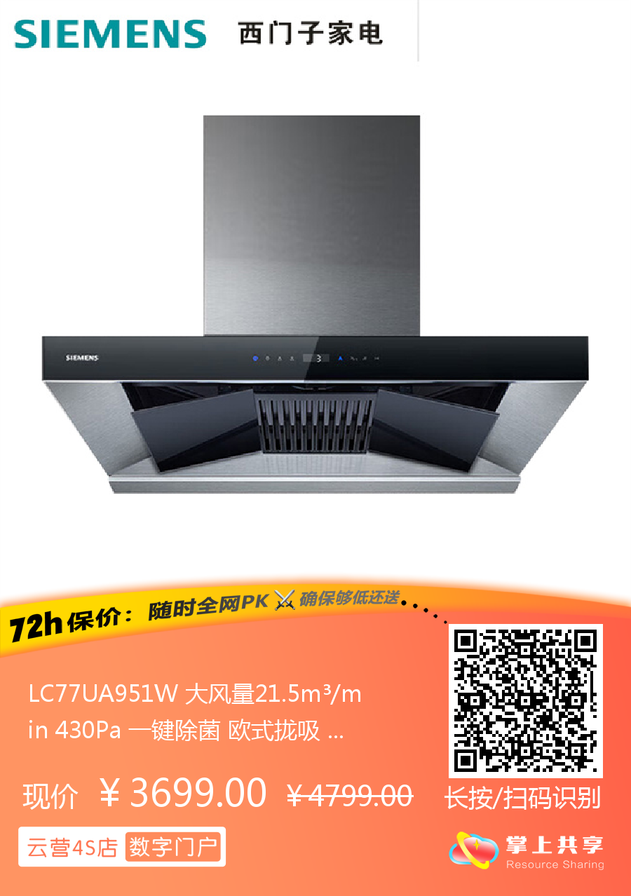 LC77UA951W 大风量21.5m³/min 430Pa 一键除菌 欧式拢吸 顶吸 西门子吸油烟机