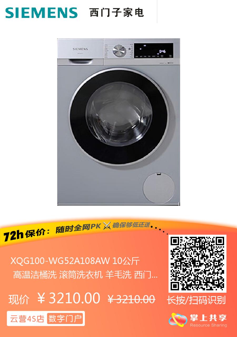XQG100-WG52A108AW 10公斤 高温洁桶洗 滚筒洗衣机 羊毛洗 西门子(SIEMENS)