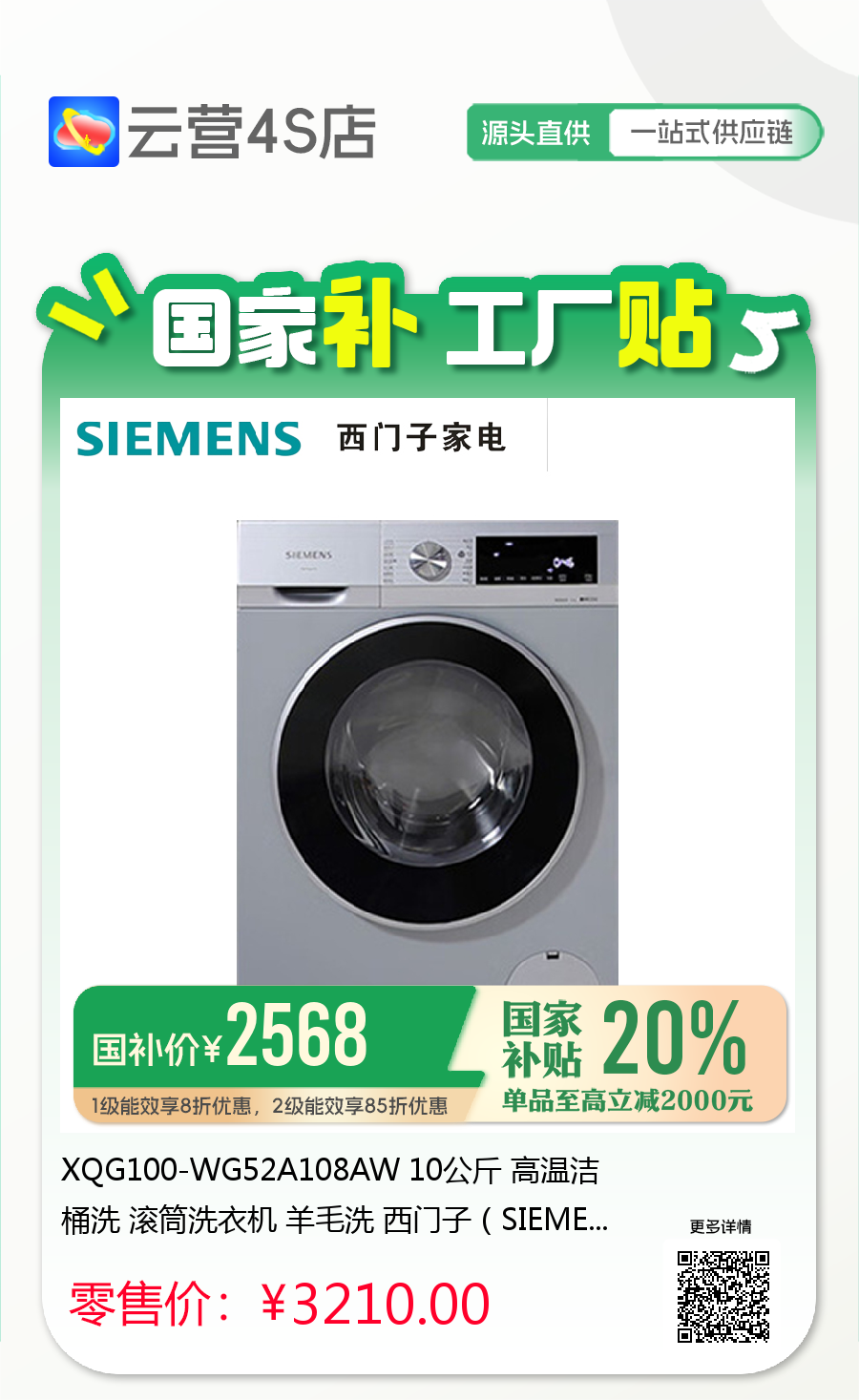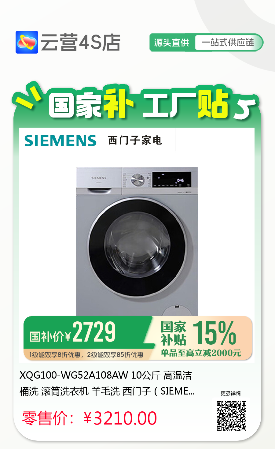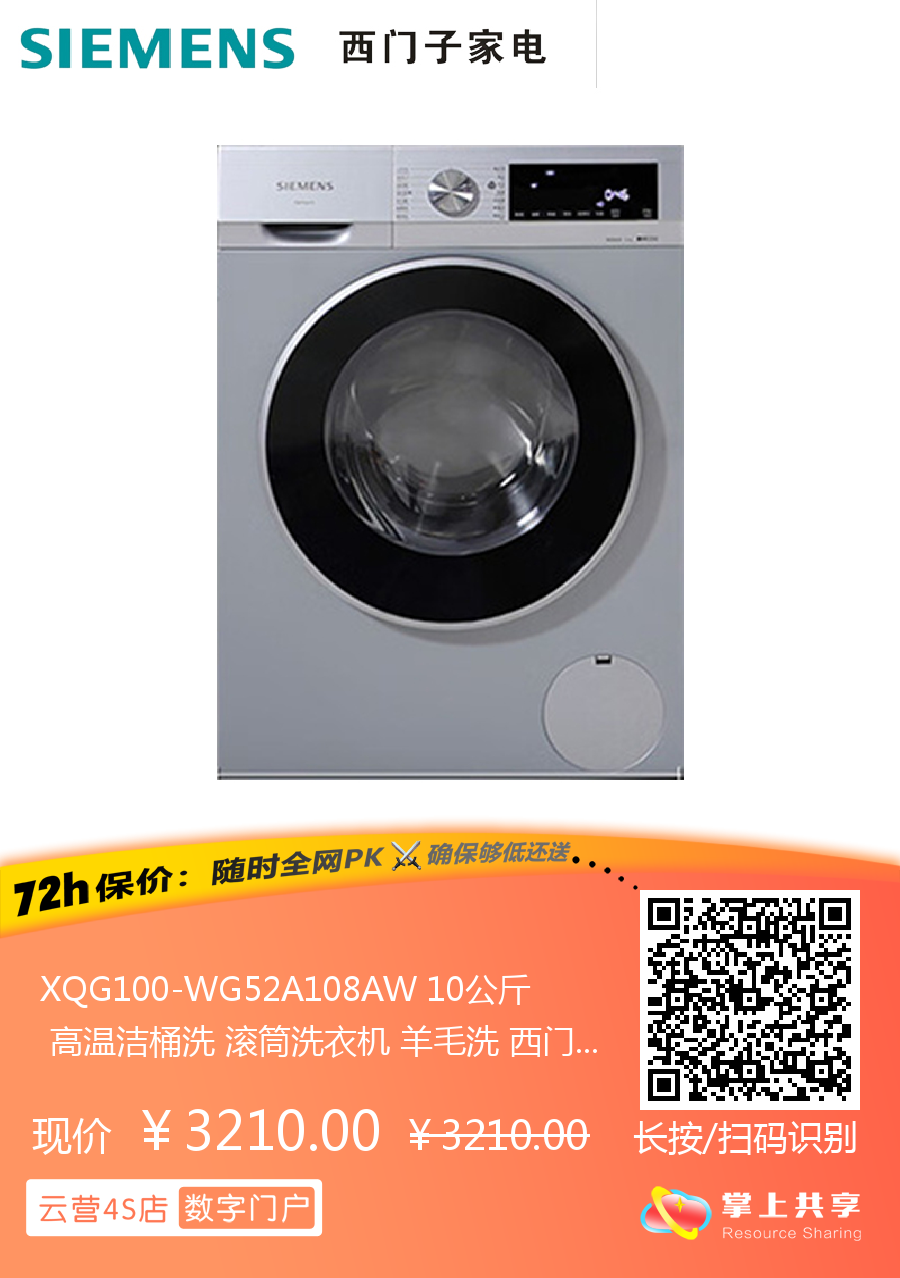 XQG100-WG52A108AW 10公斤 高温洁桶洗 滚筒洗衣机 羊毛洗 西门子(SIEMENS)