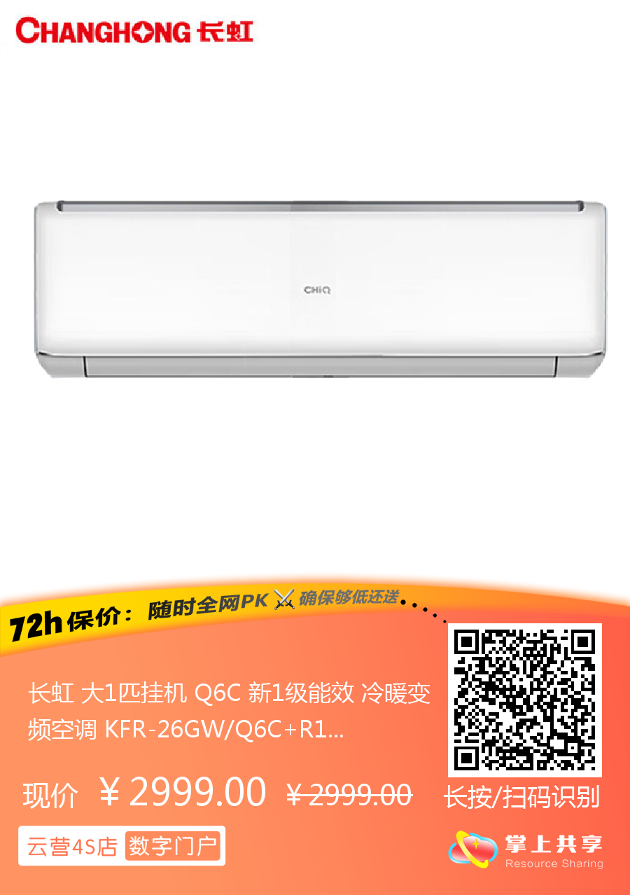 长虹 大1匹挂机 Q6C 新1级能效 冷暖变频空调 KFR-26GW/Q6C+R1