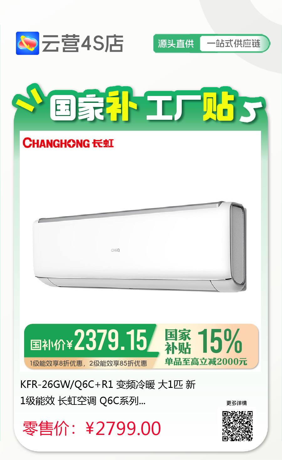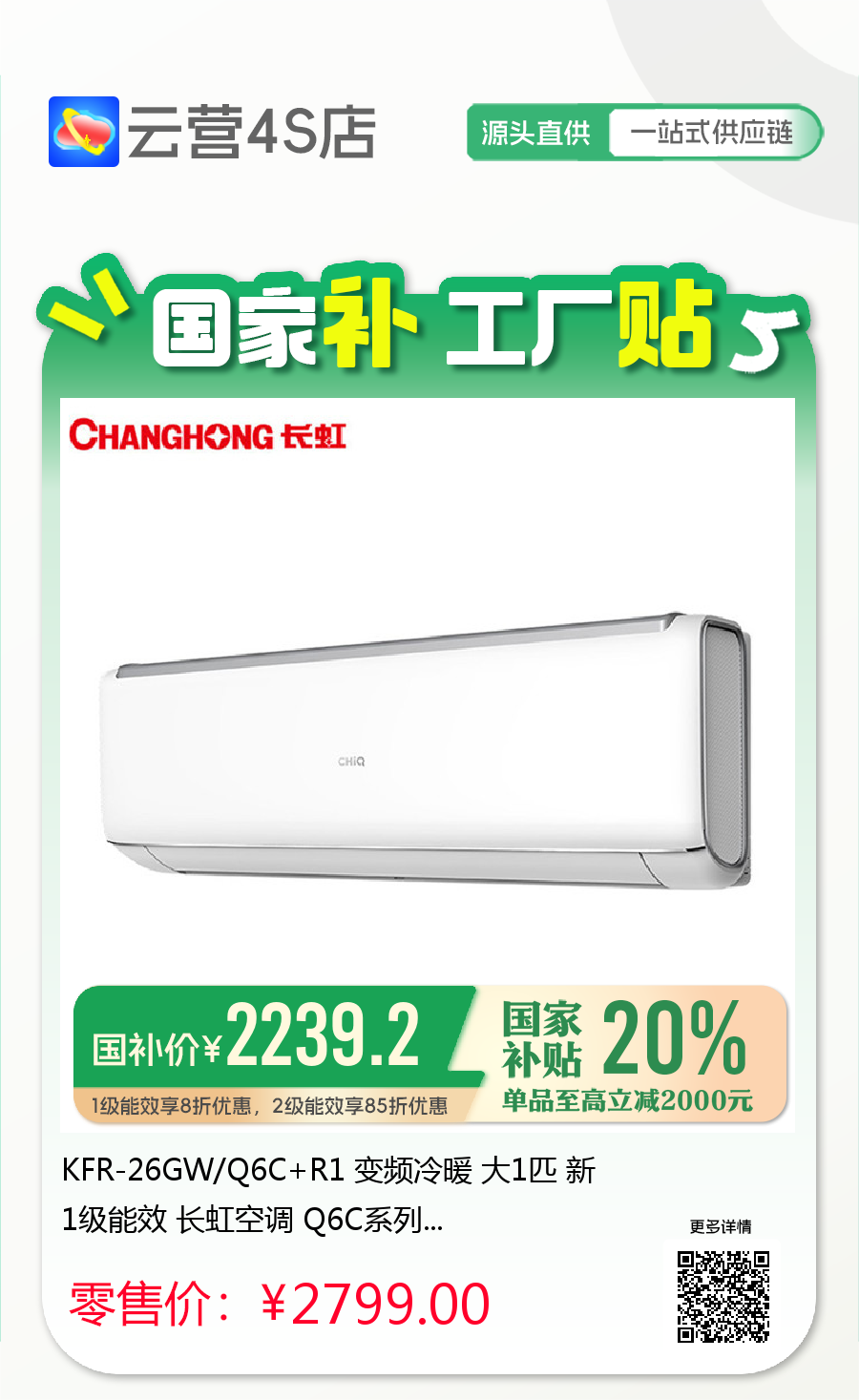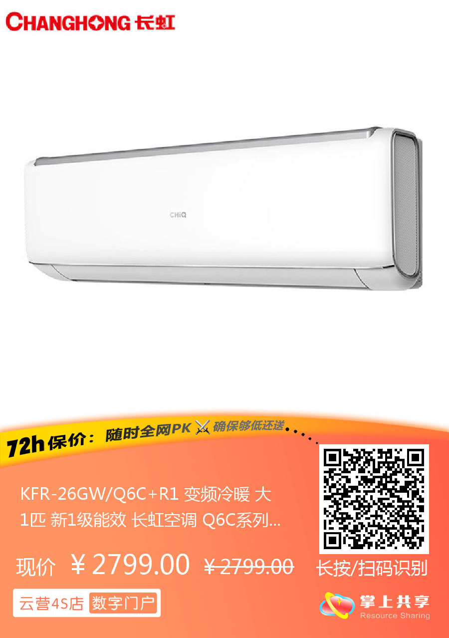 长虹 大1匹挂机 Q6C 新1级能效 冷暖变频空调 KFR-26GW/Q6C+R1
