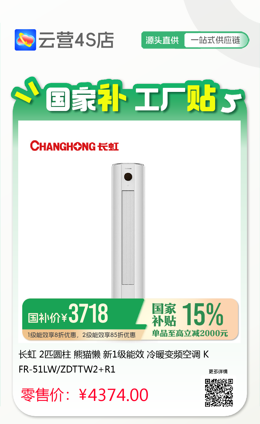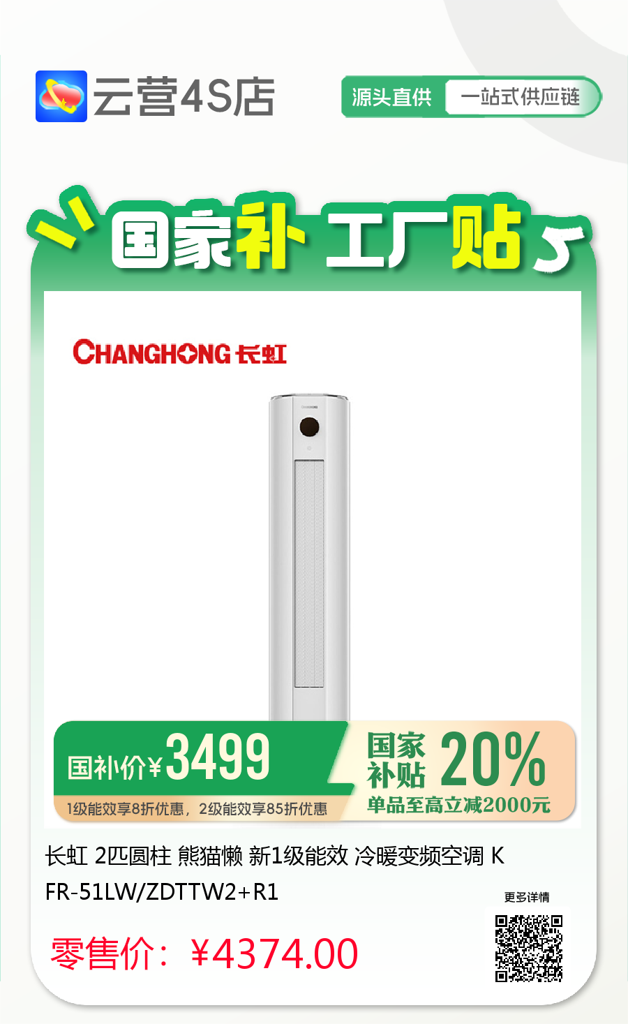 长虹 2匹圆柱 熊猫懒 新1级能效 冷暖变频空调 KFR-51LW/ZDTTW2+R1