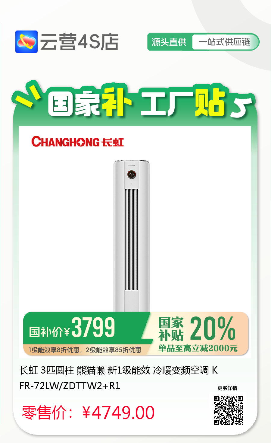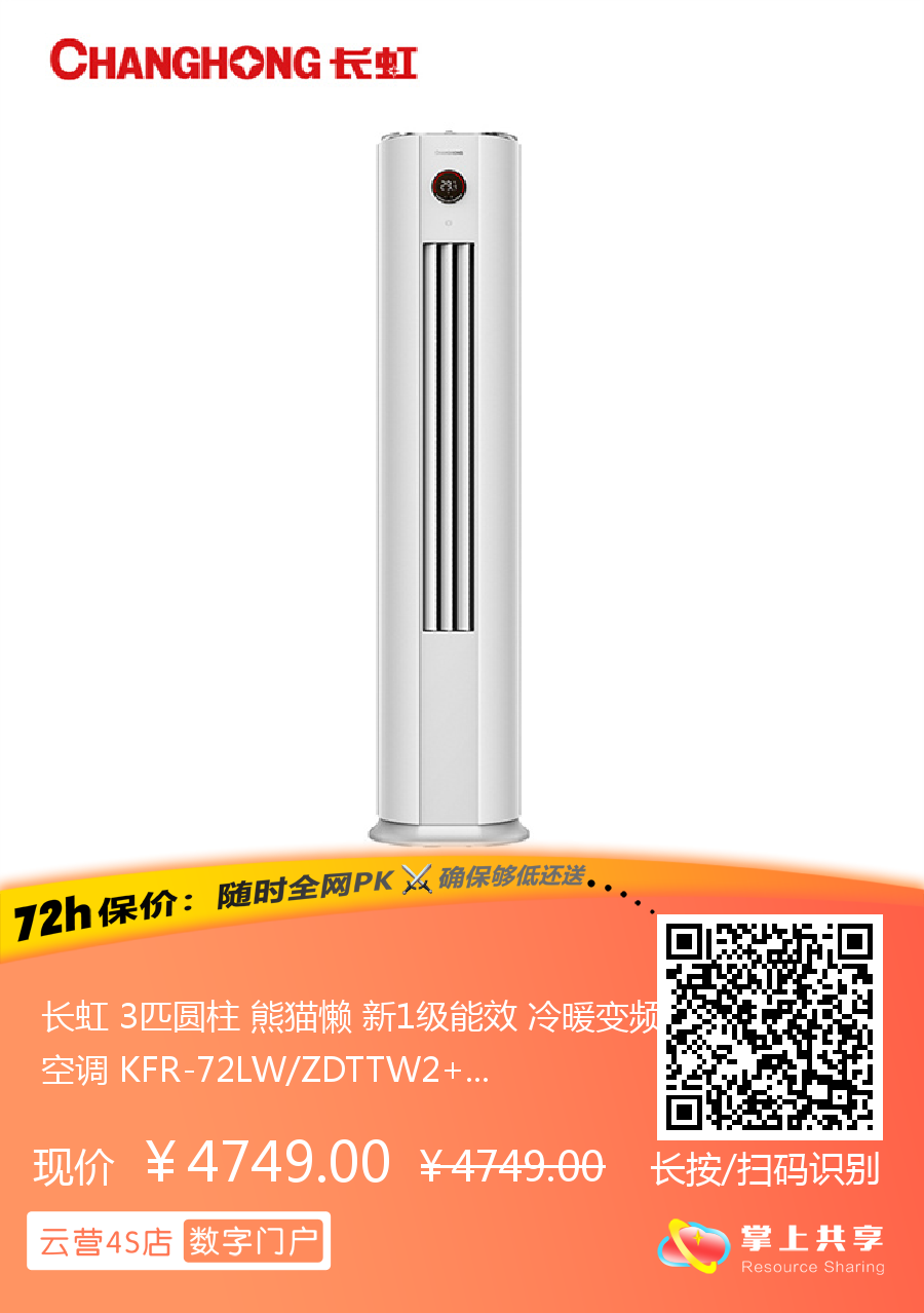 长虹 3匹圆柱 熊猫懒 新1级能效 冷暖变频空调 KFR-72LW/ZDTTW2+R1