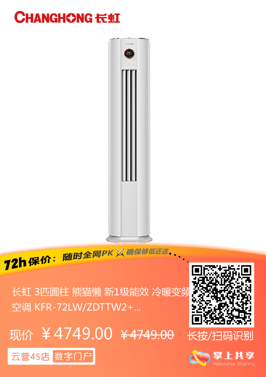 长虹 3匹圆柱 熊猫懒 新1级能效 冷暖变频空调 KFR-72LW/ZDTTW2+R1