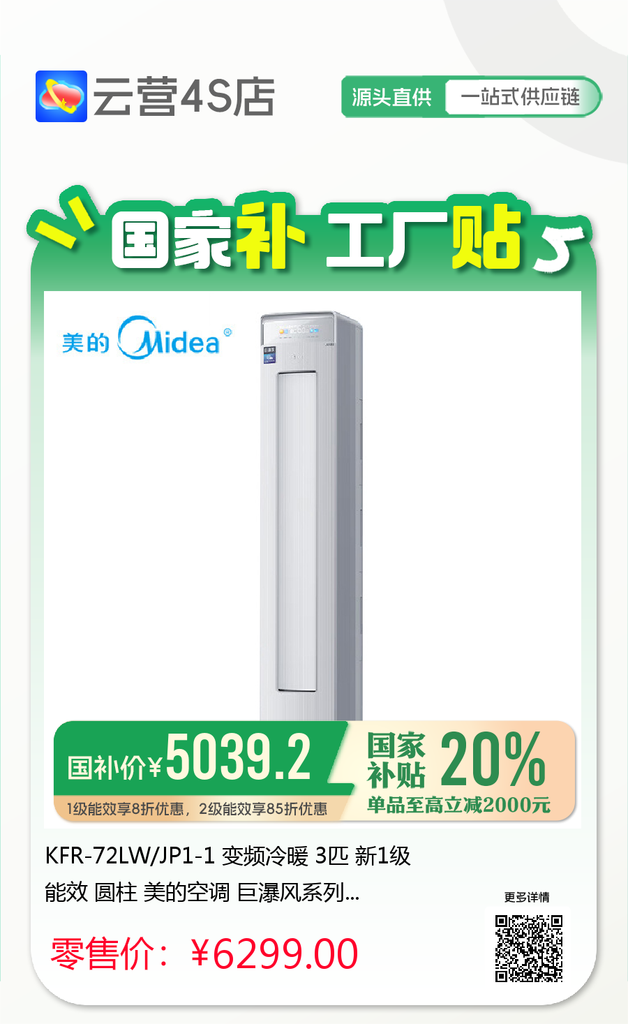 美的 3匹圆柱 巨瀑风 新1级能效 冷暖变频空调 KFR-72LW/JP1-1