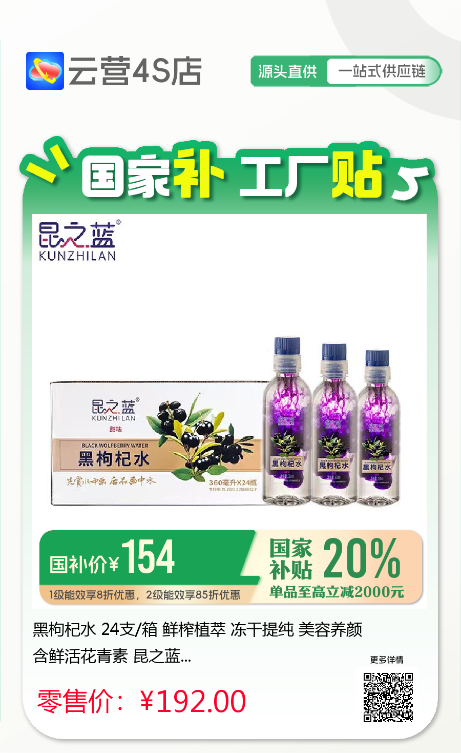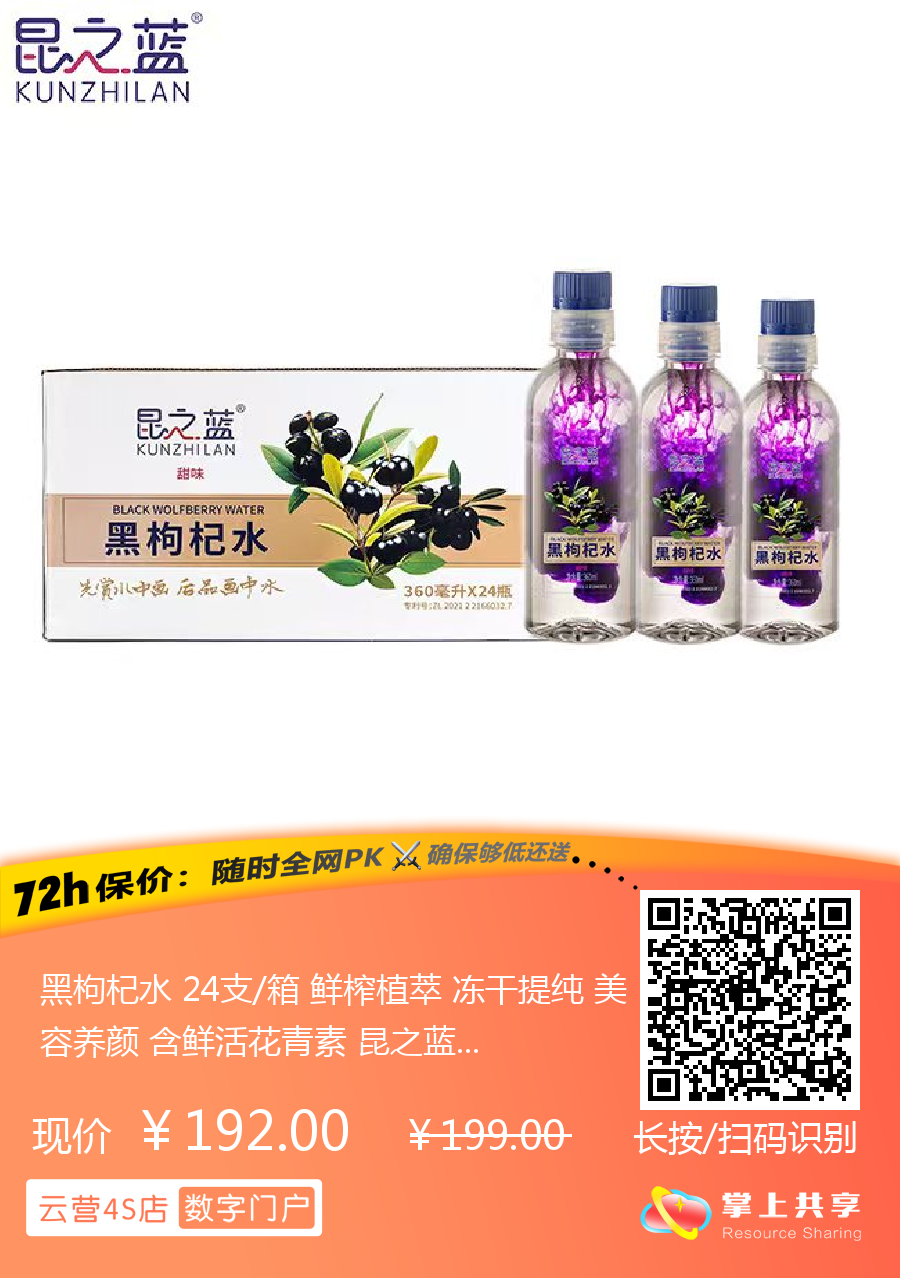 黑枸杞水 24支/箱 鲜榨植萃 冻干提纯 美容养颜 含鲜活花青素 昆之蓝
