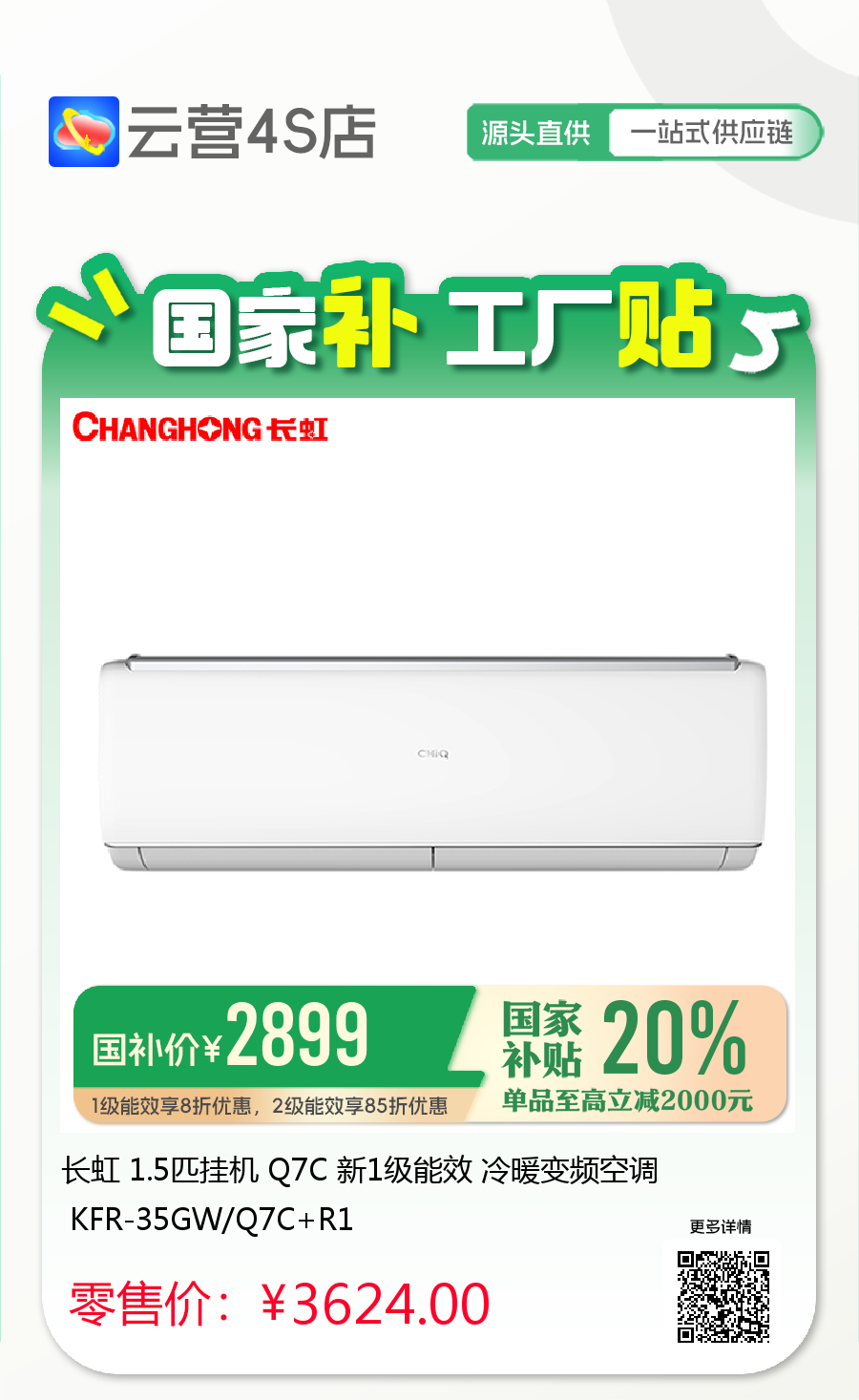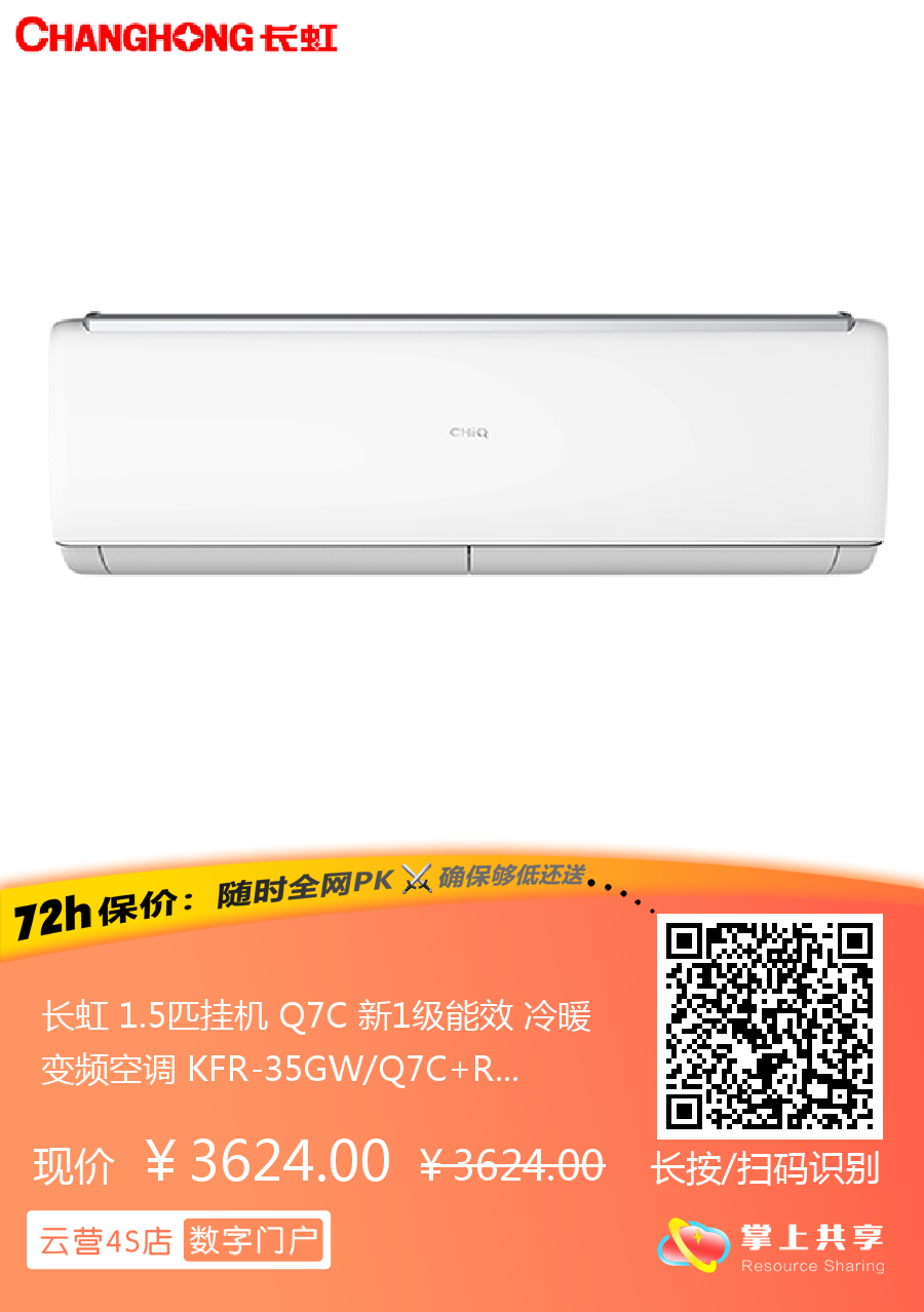 长虹 1.5匹挂机 Q7C 新1级能效 冷暖变频空调 KFR-35GW/Q7C+R1