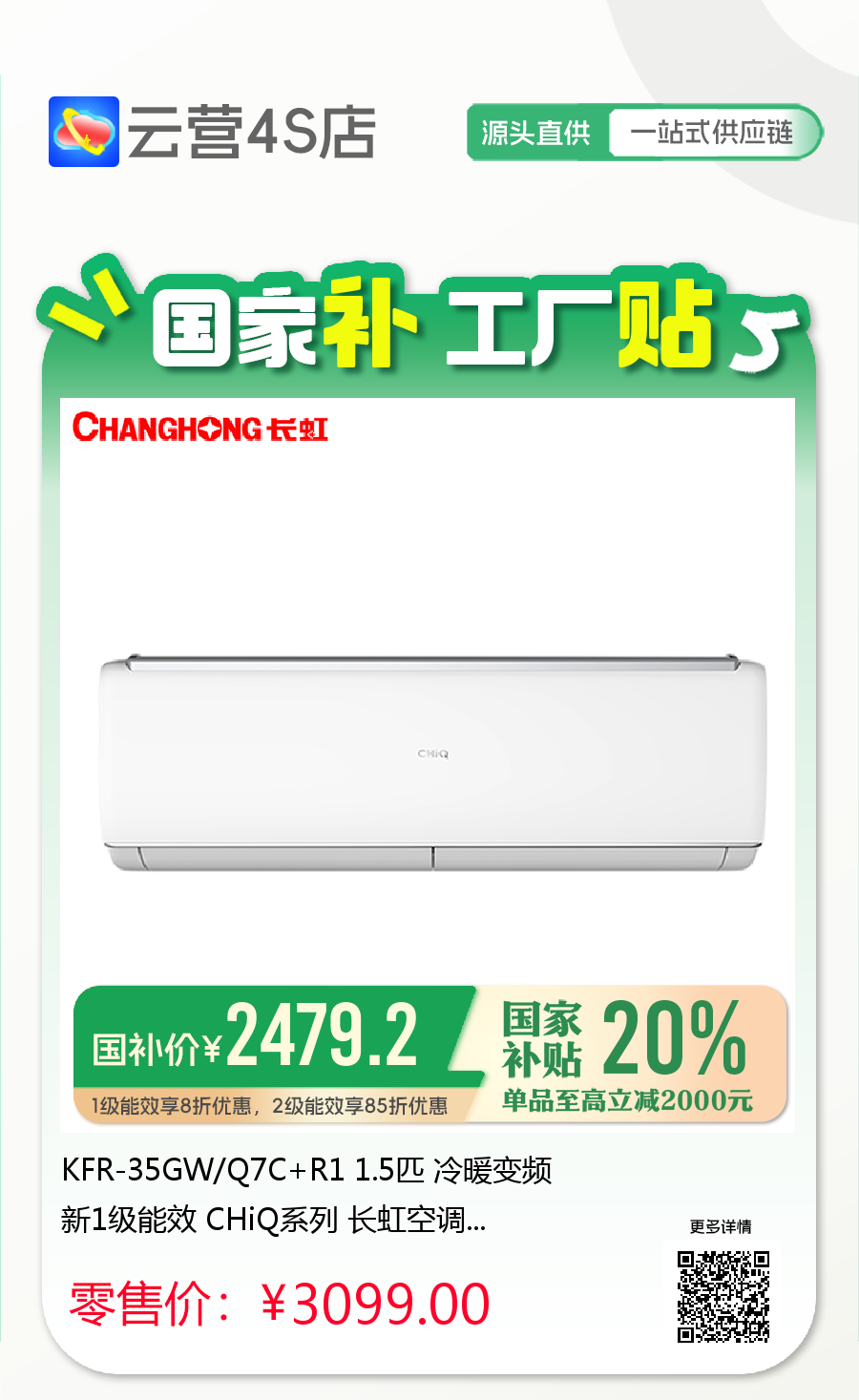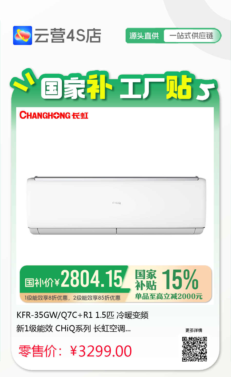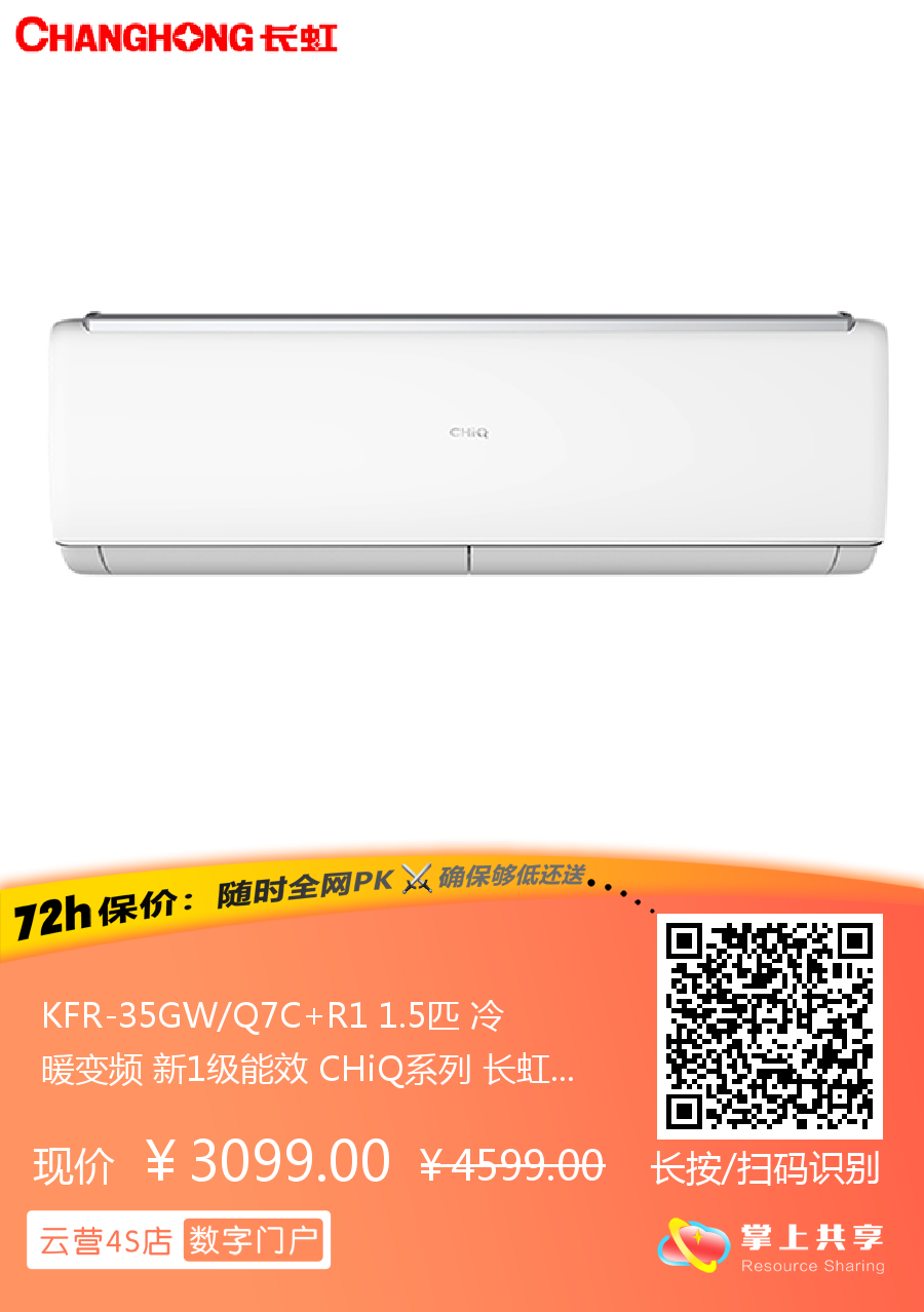长虹 1.5匹挂机 Q7C 新1级能效 冷暖变频空调 KFR-35GW/Q7C+R1