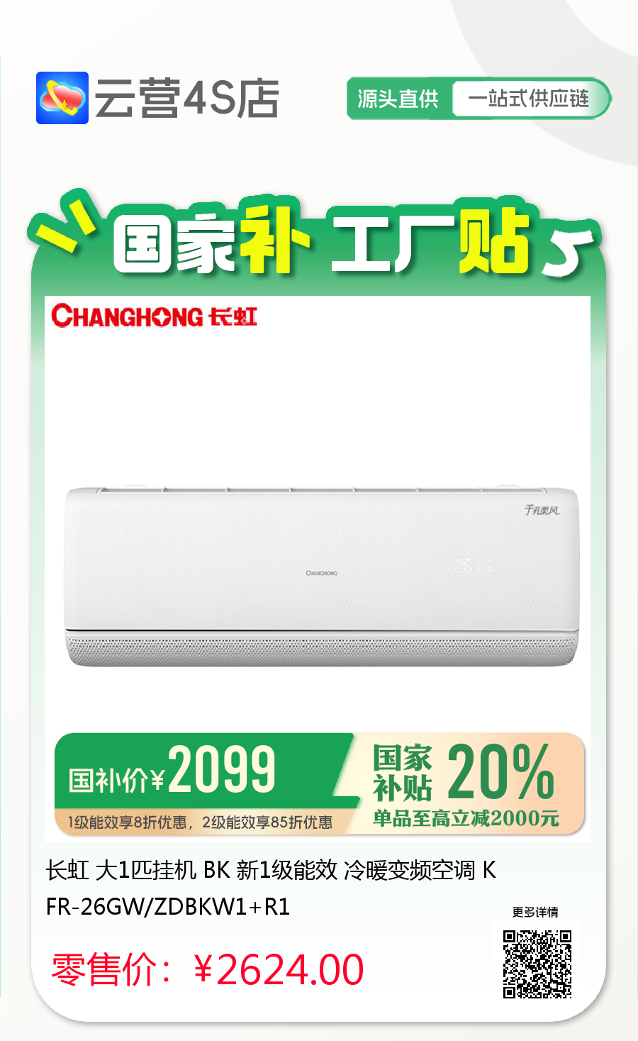 长虹 大1匹挂机 BK 新1级能效 冷暖变频空调 KFR-26GW/ZDBKW1+R1
