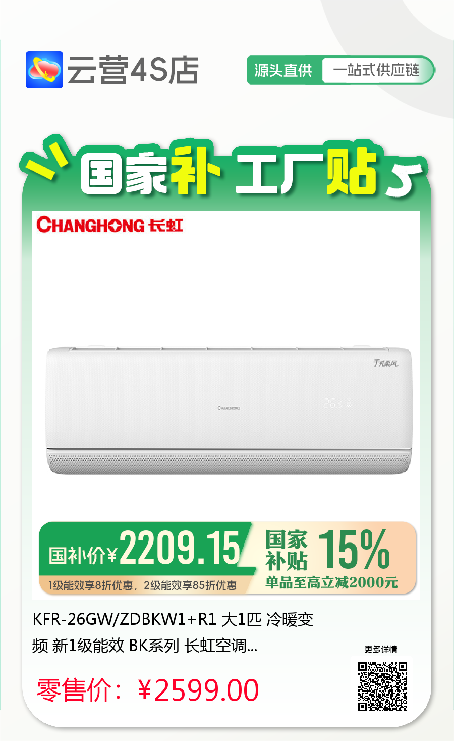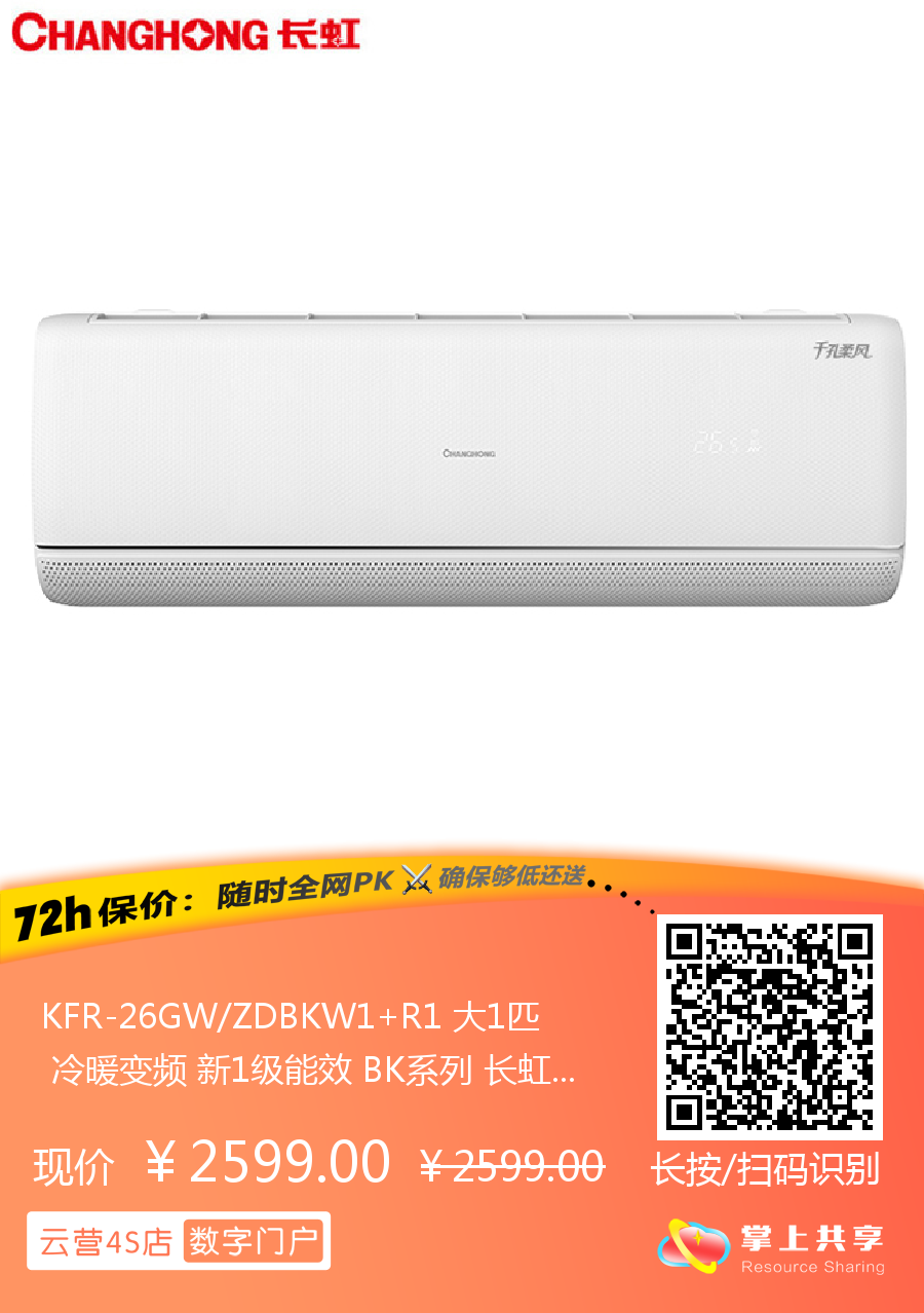 长虹 大1匹挂机 BK 新1级能效 冷暖变频空调 KFR-26GW/ZDBKW1+R1