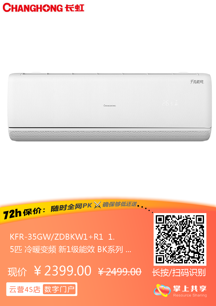 长虹 1.5匹挂机 BK 新1级能效 冷暖变频空调 KFR-35GW/ZDBKW1+R1