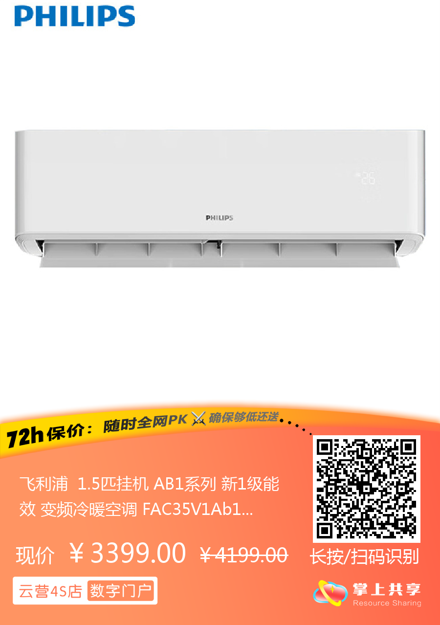 飞利浦 1.5匹挂机 AB1系列 新1级能效 变频冷暖空调 FAC35V1Ab1HR