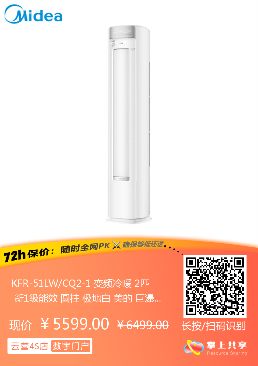 美的 2匹圆柱 巨瀑风 新1级能效 冷暖变频空调 KFR-51LW/CQ2-1