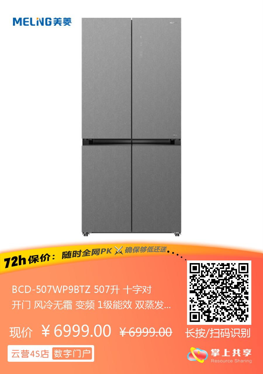 BCD-507WP9BTZ 507升 十字对开门 风冷无霜 变频 1级能效 双蒸发器系统 零平嵌 美菱(MeiLing)